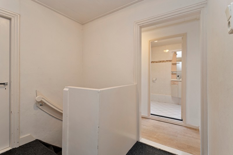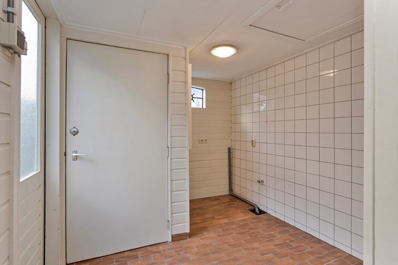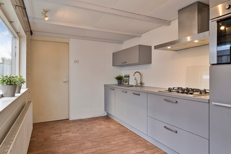 De vloer van de opkamer is verlaagd waardoor één geheel is ontstaan. Fraaie suitedeuren zouden niet misstaan tussen voor- en achterzijde maar dat mag u uiteraard zelf invullen. De over de volle breedte van de woning gelegen achterkamer sluit aan op de achter de woning gelegen keuken. Deze is voorzien van een inbouwkeuken met gaskookplaat, afzuiging, oven, koelkast en vaatwasser. Achter de keuken vinden we de achterentree/bijkeuken met toilet en CV-ruimte. Boven de aanbouw bevindt zich een zolderberging.