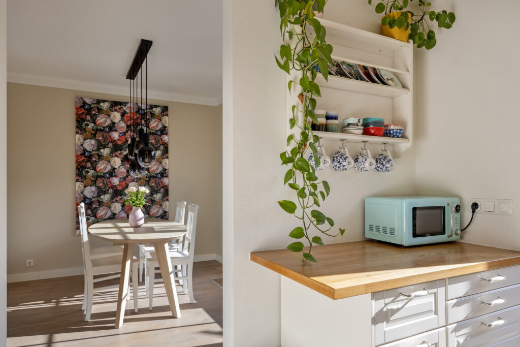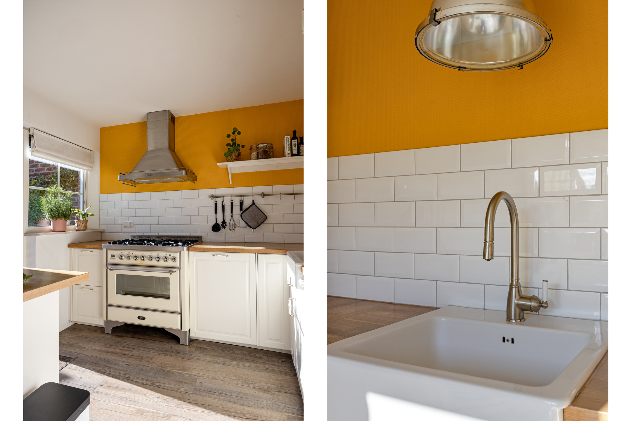 Én de half open keuken maakt het tot een geheel. De inbouwkeuken is een gewaagde doch geslaagde mix tussen modern en landelijk. De keramische gootsteen, het grote 6-pits RVS-fornuis met oven en RVS afzuiging. Uiteraard ontbreken de vaatwasser en koelkast ook niet.
