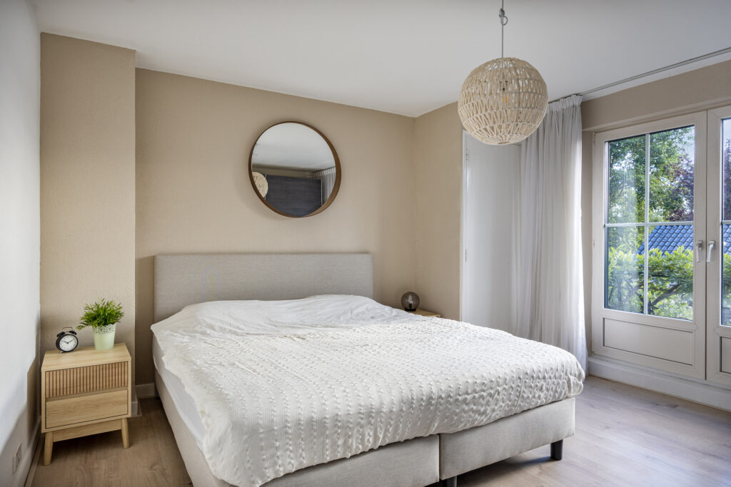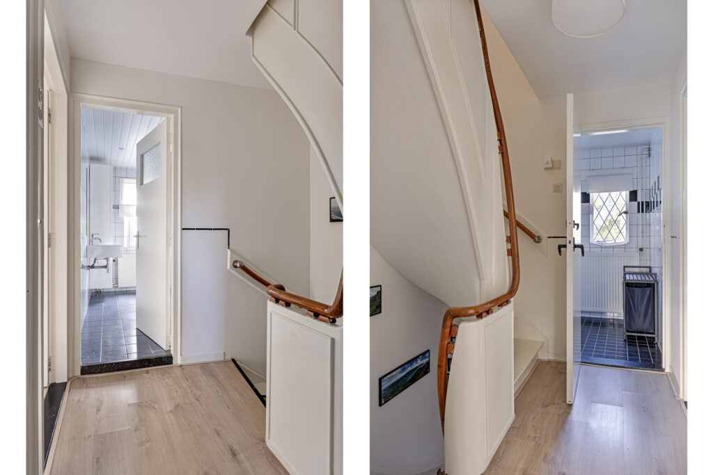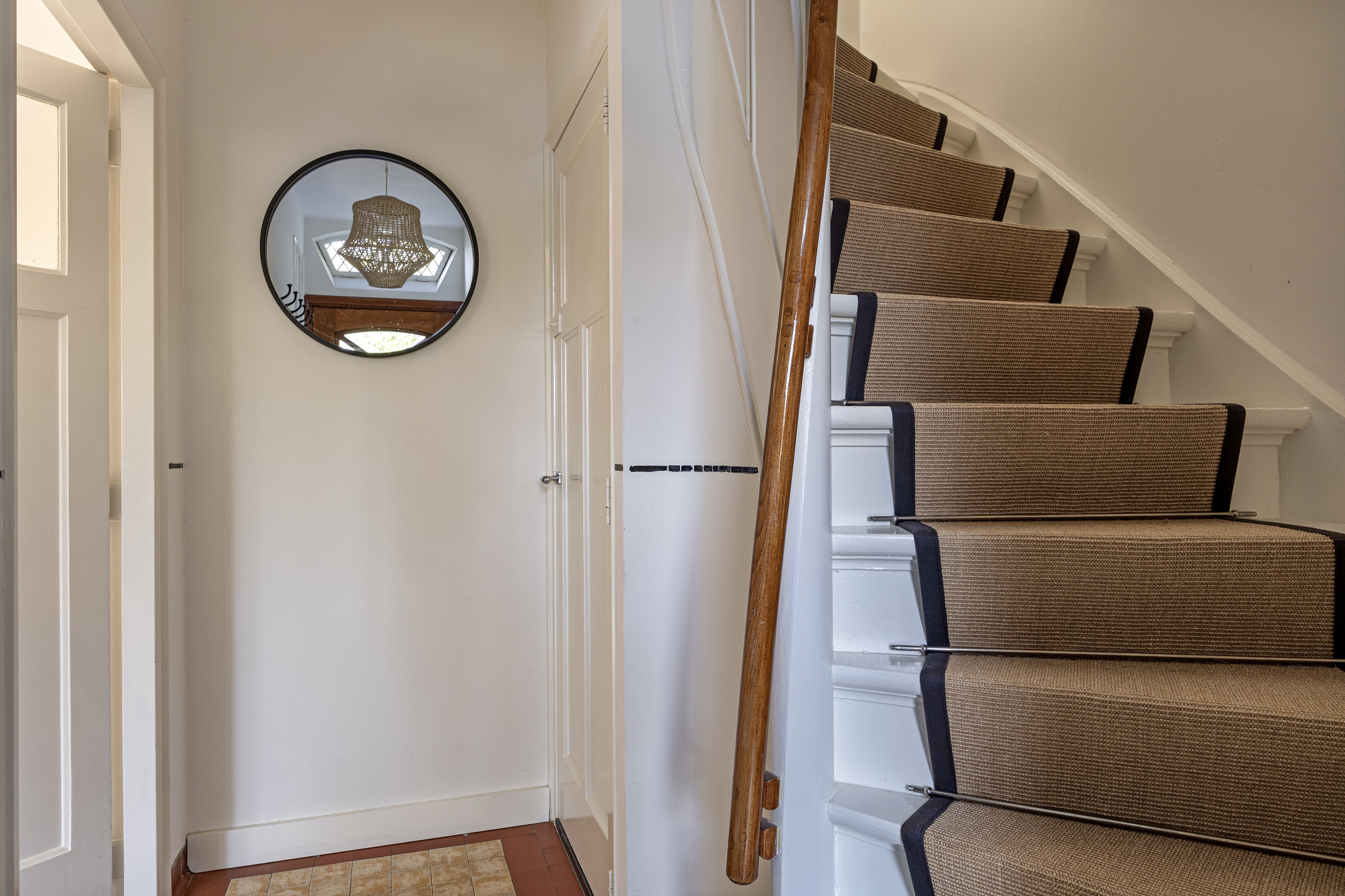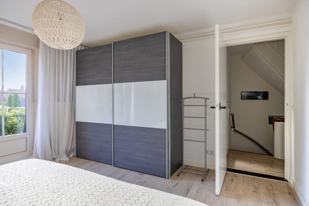 Het trappenhuis doet niet onder voor de rest van het huis. De fraai vormgegeven trappen naar 1e en 2e verdieping zijn kunstwerken op zich. Op de 1e verdieping vinden we 2 ruime slaapkamers met vaste kastruimte. De slaapkamer aan de achterzijde heeft 2 openslaande deuren naar het balkon. In de ochtend stap je de ruime badkamer in en deze heeft alles wat je nodig hebt: een ligbad, inloopdouche en wastafel. De toilet vinden we aan de andere zijde van de overloop. Ook de wasmachine en droger vinden hier een plek.