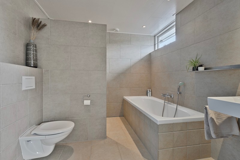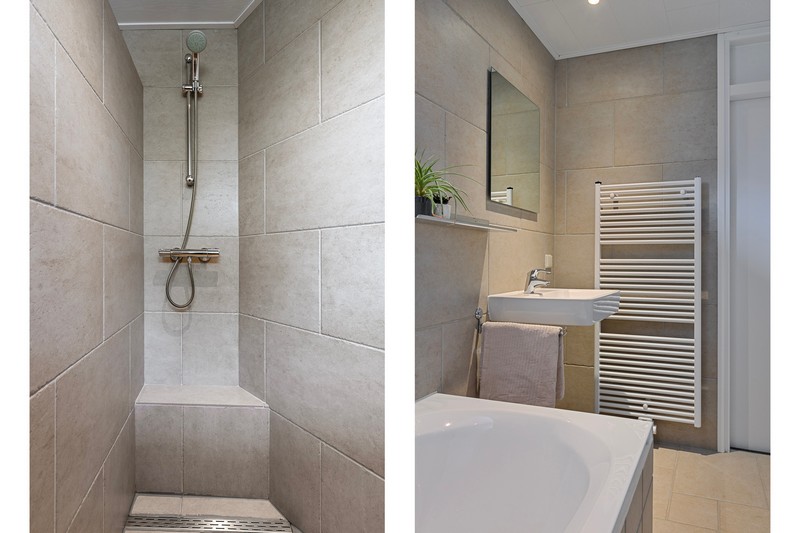 Op de eerste verdieping zijn drie ruime slaapkamers te vinden. De ouderslaapkamer biedt toegang tot het balkon over de volledige breedte van de achtergevel. De moderne badkamer in een lichte kleurstelling, is voorzien van een inloopdouche, bad, wastafelmeubel en toilet.