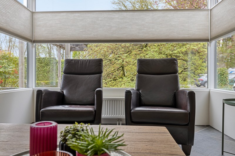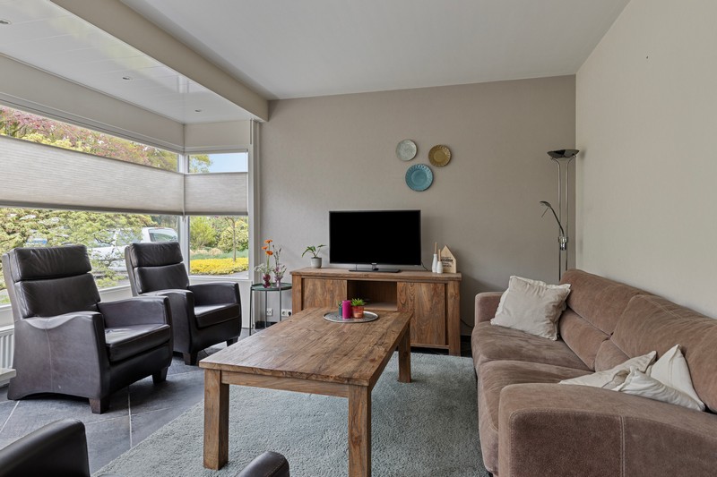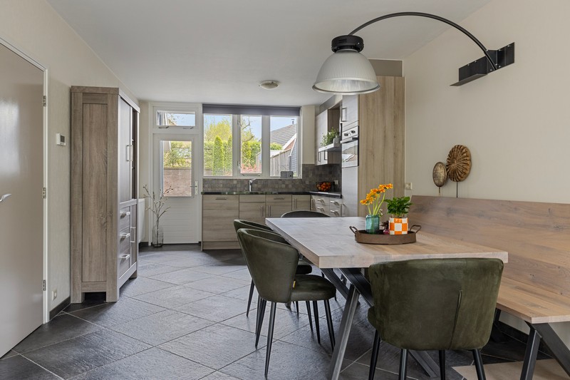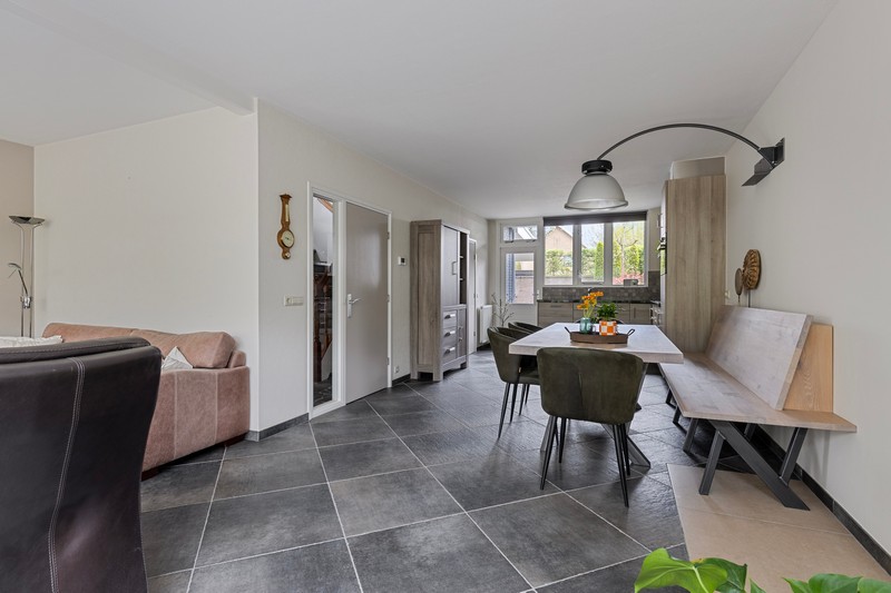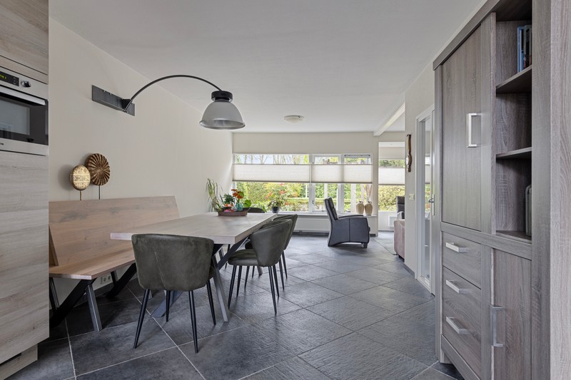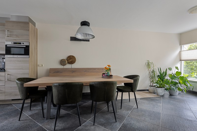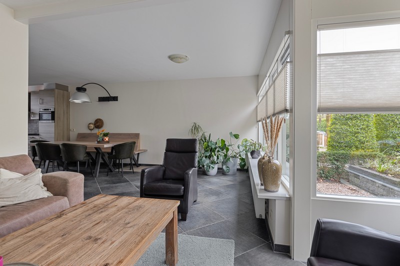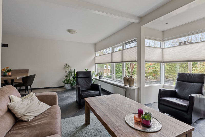 Dan door naar de L-vormige woonkamer. Die is zeer royaal. Door de vele ramen in de voorgevel en erker heb je een enorme hoeveelheid daglicht. Ook geniet je van vrij uitzicht op het prachtige Raabos. Daarnaast is er voldoende ruimte om een gezellige zithoek te creëren en is er meer dan genoeg ruimte voor een grote eettafel, die uitkijkt op de achtertuin.
