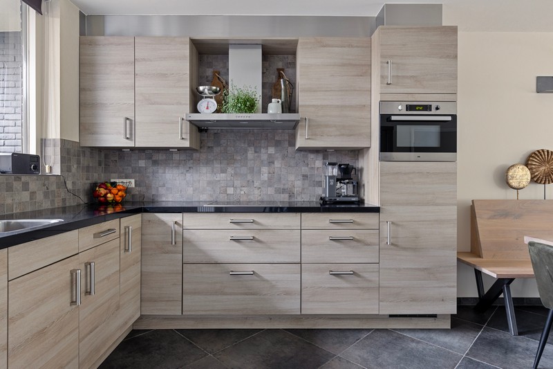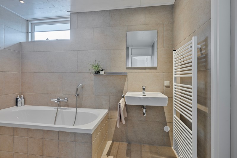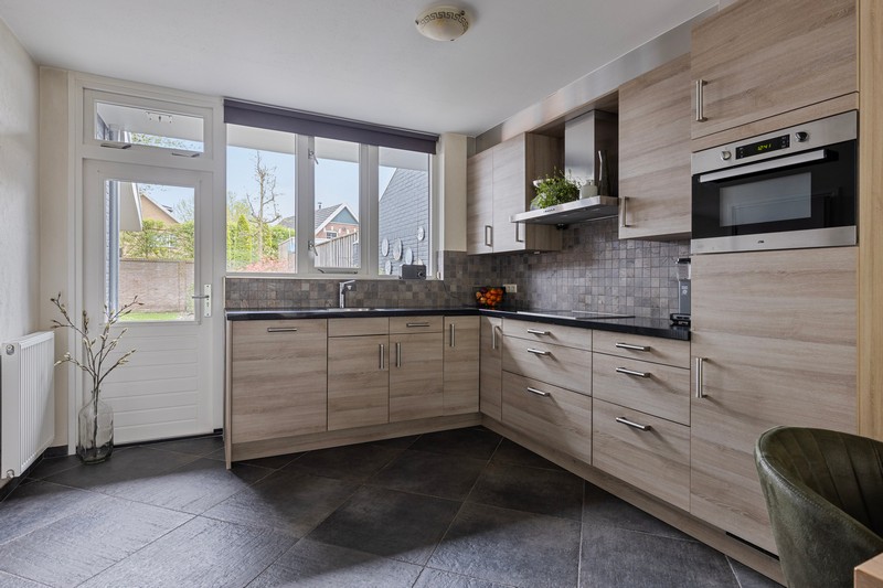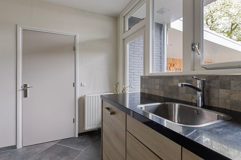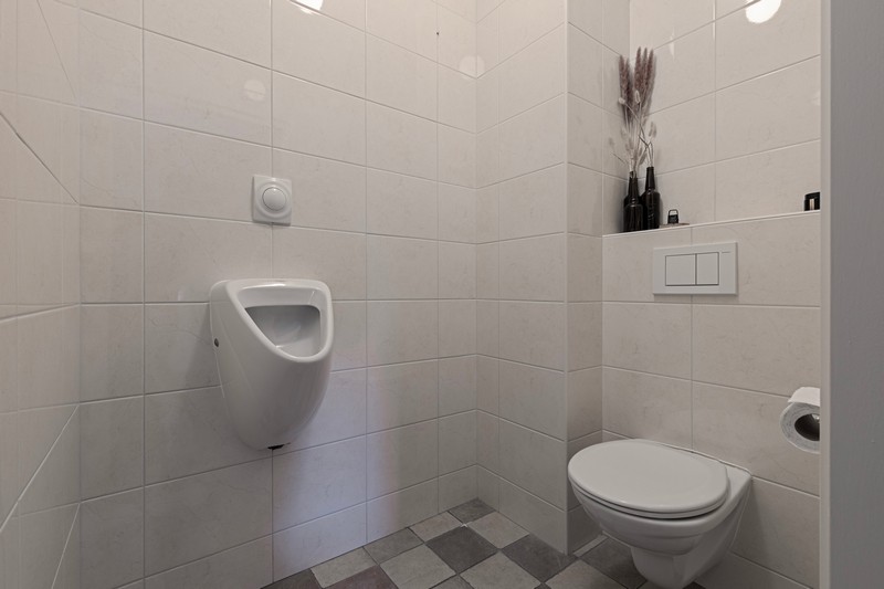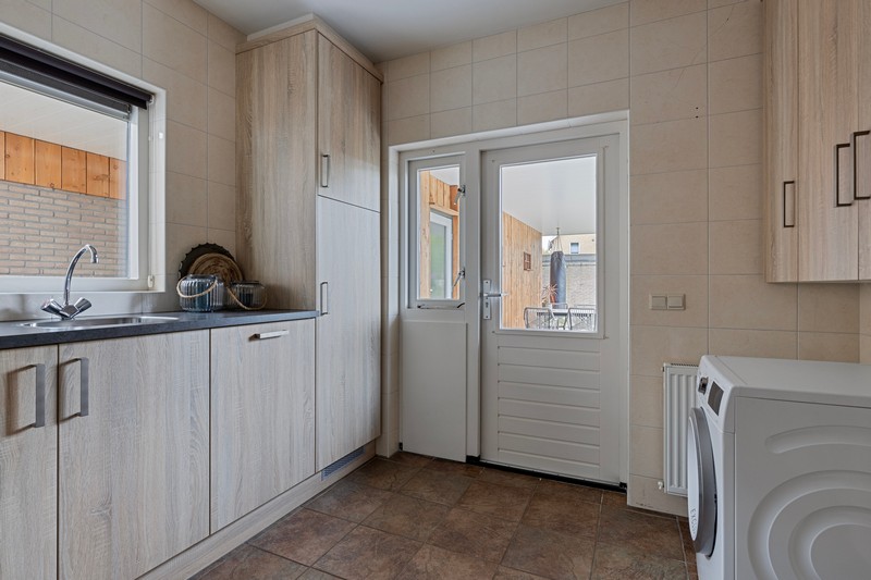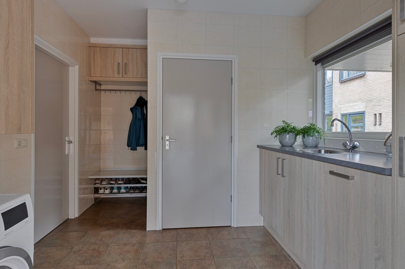 De open keuken is voorzien van een moderne inbouwkeuken met koelkast, combi-oven, keramische kookplaat, afzuigkap en vaatwasser. Via de keuken kom je in de bijkeuken waar plaats is voor voorraadkasten en/of wasmachine en -droger. De ruime toilet is voorzien van zwevend toilet en urinoir. Ideaal!