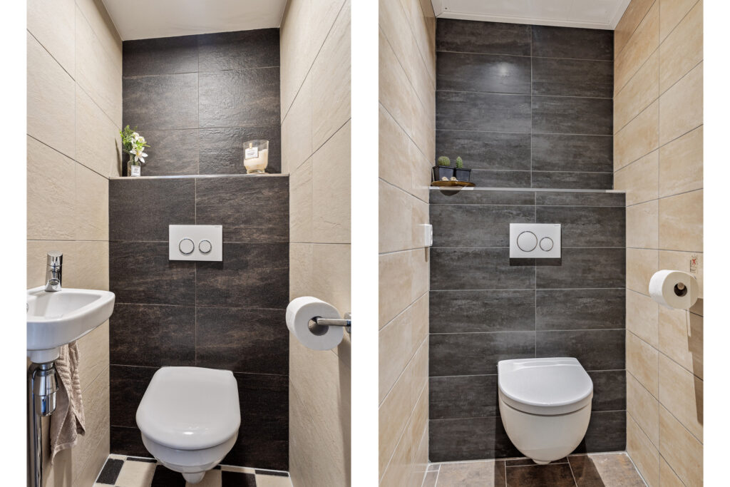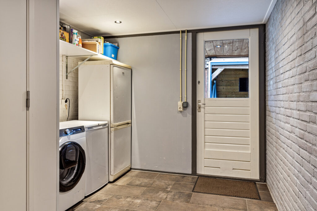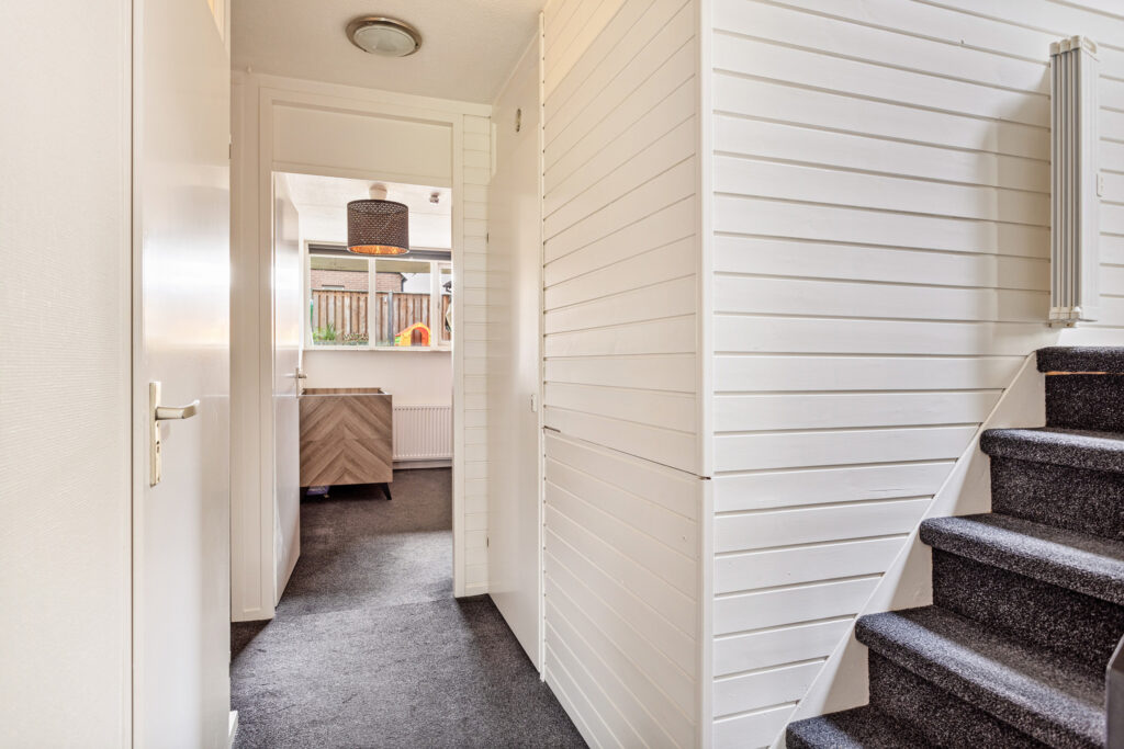 Laten we eens binnen kijken. We komen binnen in de hal met meterkast, toilet en trapopgang naar de gym (of uw eigen praktijkruimte aan huis). Aan de rechterzijde vinden we de bijkeuken met aansluitingen voor de wasmachine en -droger en een handig 2e toilet. Gaan we vanuit de hal naar links, dan komen we met een klein trapje in de woonkamer met balkon en aan de voorkant is de grote keuken gesitueerd.