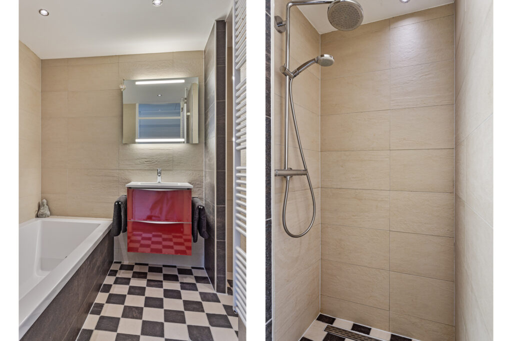 Laten we ook het heerlijke slaapklimaat op de verdieping onder de woonkamer en keuken niet vergeten. De slaapkamers zijn half onder het maaiveld gelegen zodat je vrijwel het hele jaar door eenzelfde temperatuur op de kamers hebt. Ook de moderne badkamer vinden we op deze verdieping en deze is voorzien van een inloopdouche, bad en een wastafelmeubel.