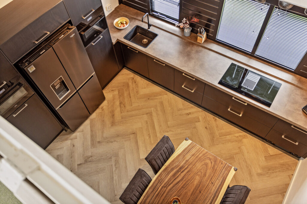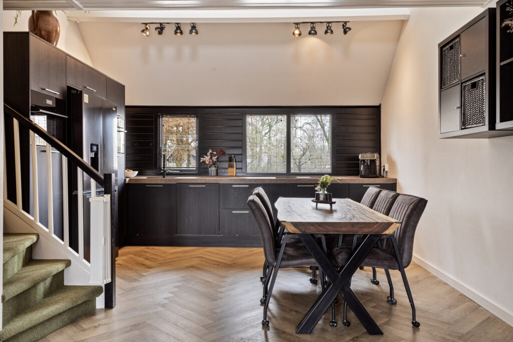 De woonkeuken is voorzien van een prachtige moderne inbouwkeuken met donker composiet aanrechtblad. De keuken beschikt over een inductiekookplaat met geïntegreerde afzuiging, twee combi-ovens, een “Amerikaanse” koelkast en vaatwasser. De raampartij over vrijwel de volledige breedte van de woning zorgt voor een prettige lichtinval en het uitzicht is schitterend.