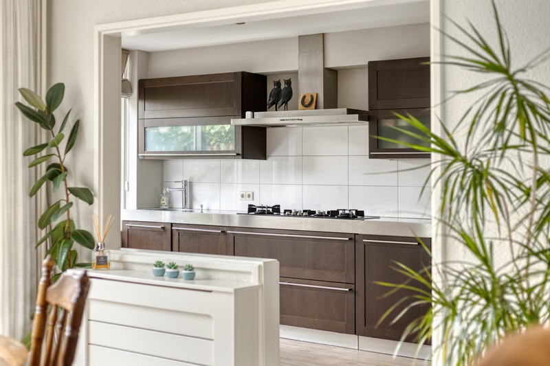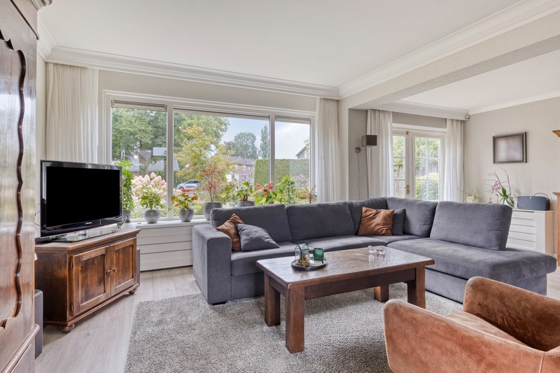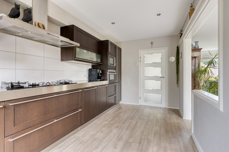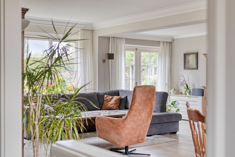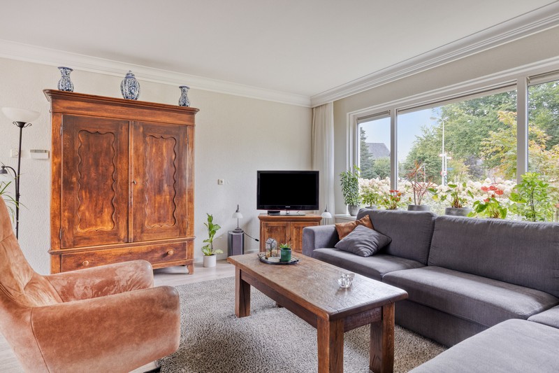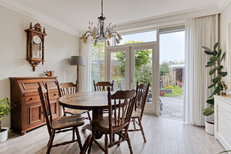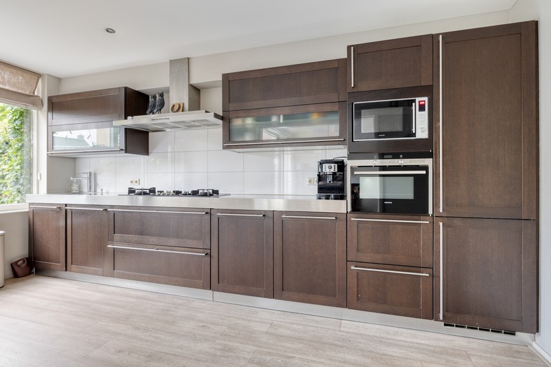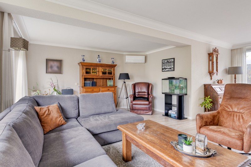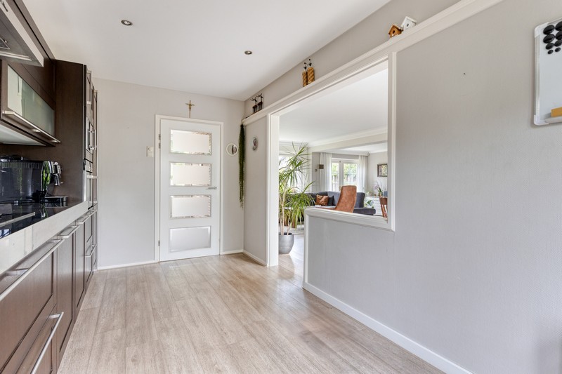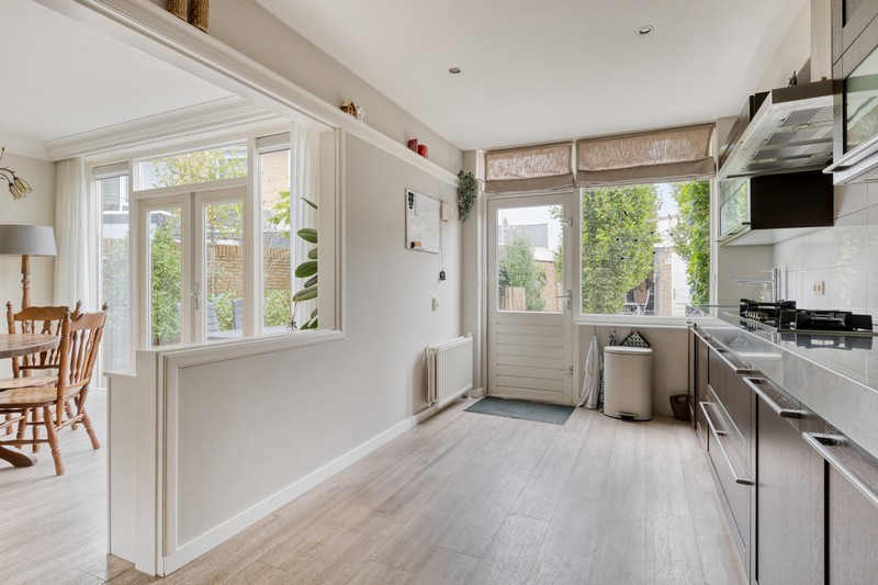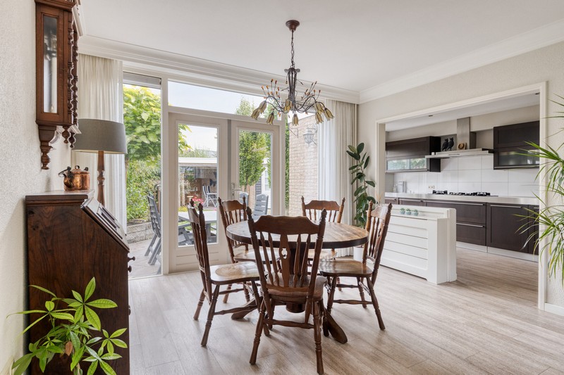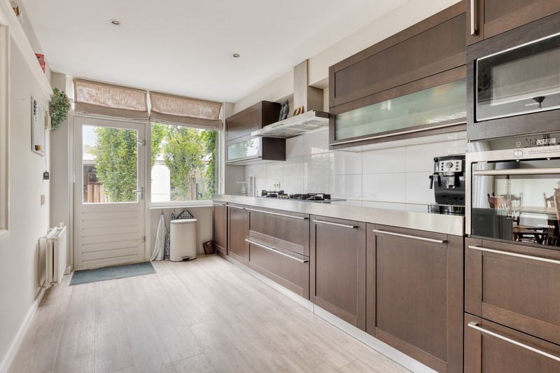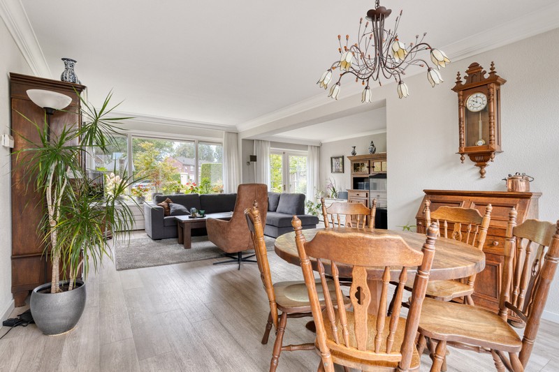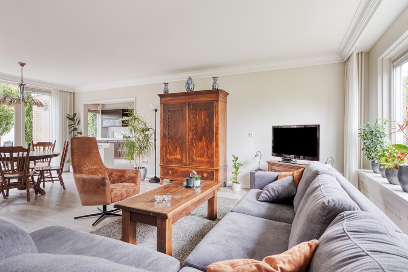 Via de voordeur komen we in de hal met toilet, bergkast/meterkast en trapopgang naar de 1e verdieping. Woonkamer en keuken zijn riant met een oppervlak van ruim 50 m².  De L-vormige uitgebouwde woonkamer baadt in het vele (zon)licht. Zowel aan de voorzijde als achterzijde vinden we dubbele openslaande deuren waardoor binnen en buiten nauw met elkaar verbonden zijn. De halfopen keuken is voorzien van een moderne inbouwkeuken met gaskookplaat, afzuiging, koelkast, vriezer, combimagnetron en vaatwasser.