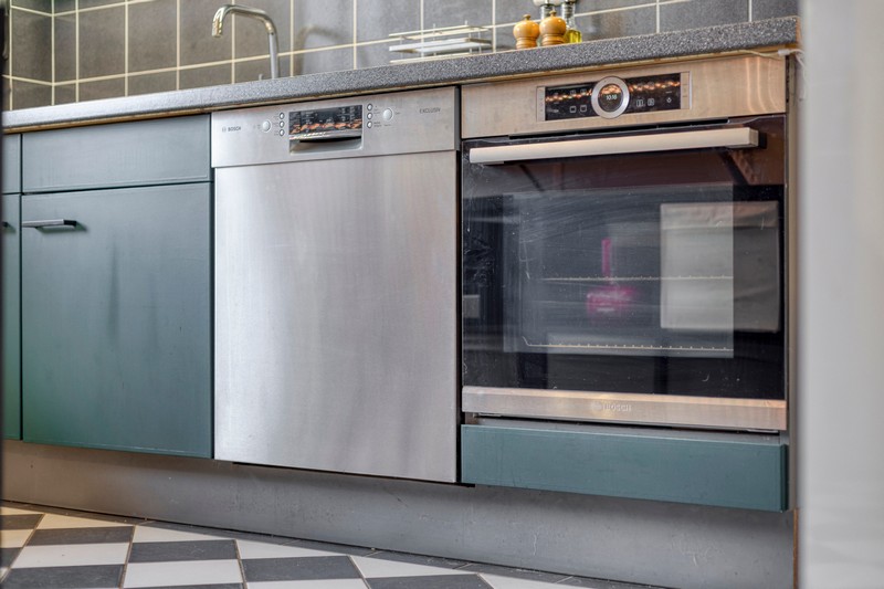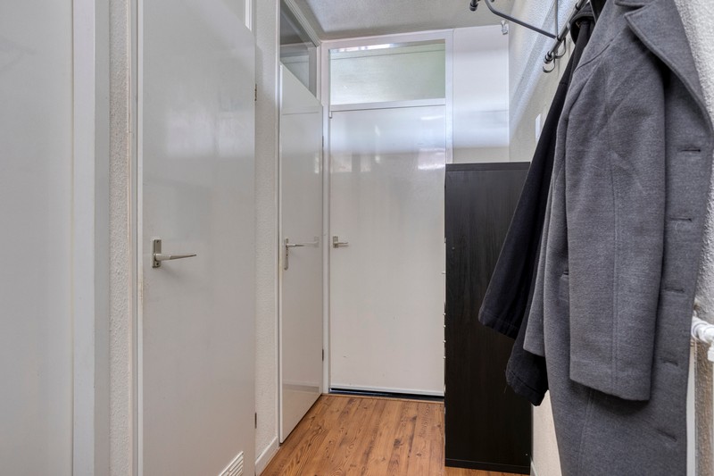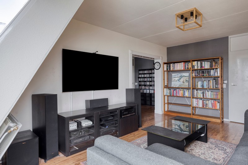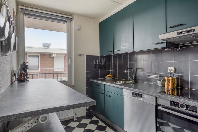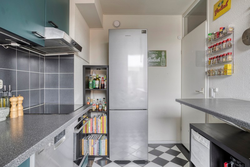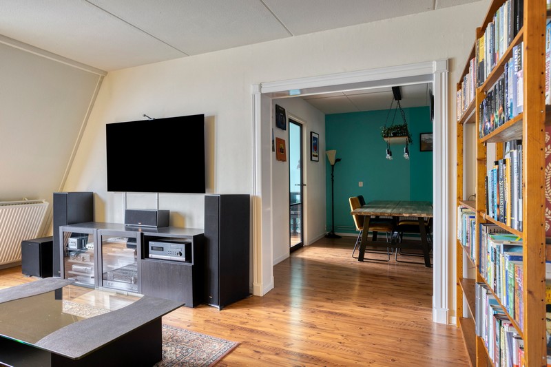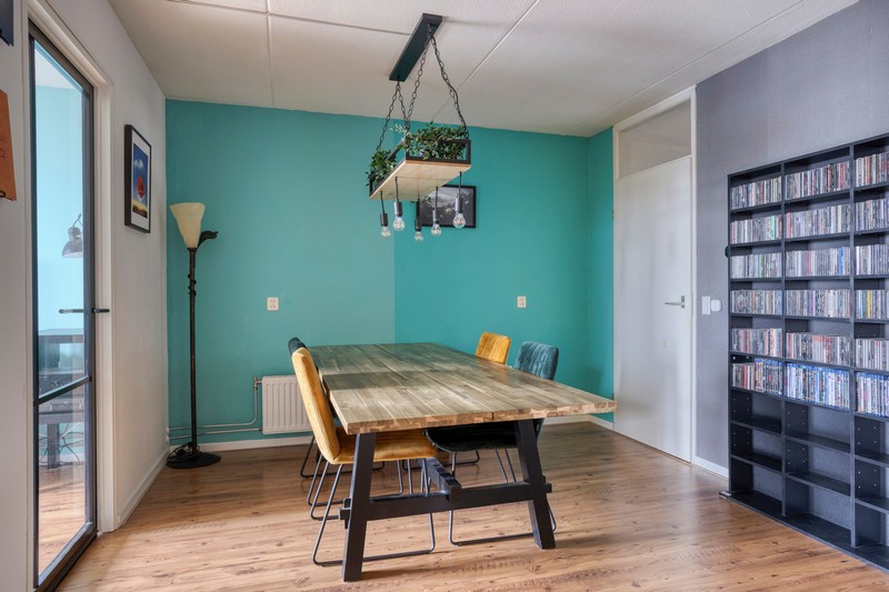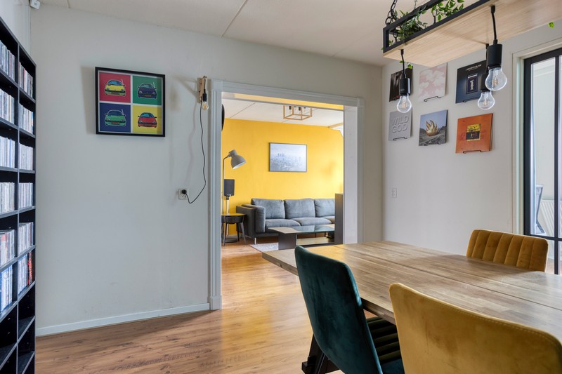 Via de hal met meterkast komen we in de dichte keuken met inbouwkeuken voorzien van apparatuur. Lopen we verder dan komen we in de eetkamer. Een grote eettafel met plek voor 6 personen kan hier makkelijk staan. Van de voormalige (zeer) ruime woonkamer is middels een vaste wand met steel-look deur, een werkkamer afgesplitst. Dubbele deuren zorgen voor het nodige daglicht en toegang tot het balkon.