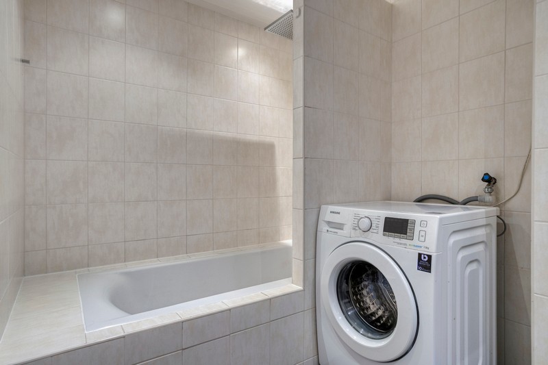 Via een gang met kastenwand komen we in de slaapkamer waar een groot 2-persoons bed kan staan. De badkamer is voorzien van een lichte tegel en is voorzien van een ligbad (jazeker een ligbad) en wastafel.