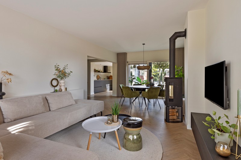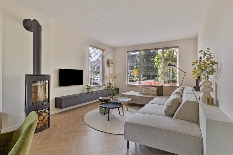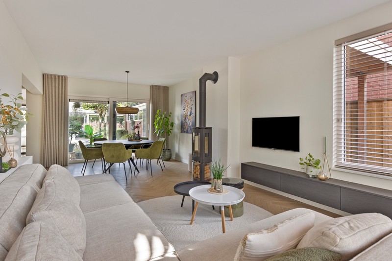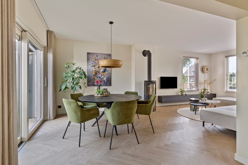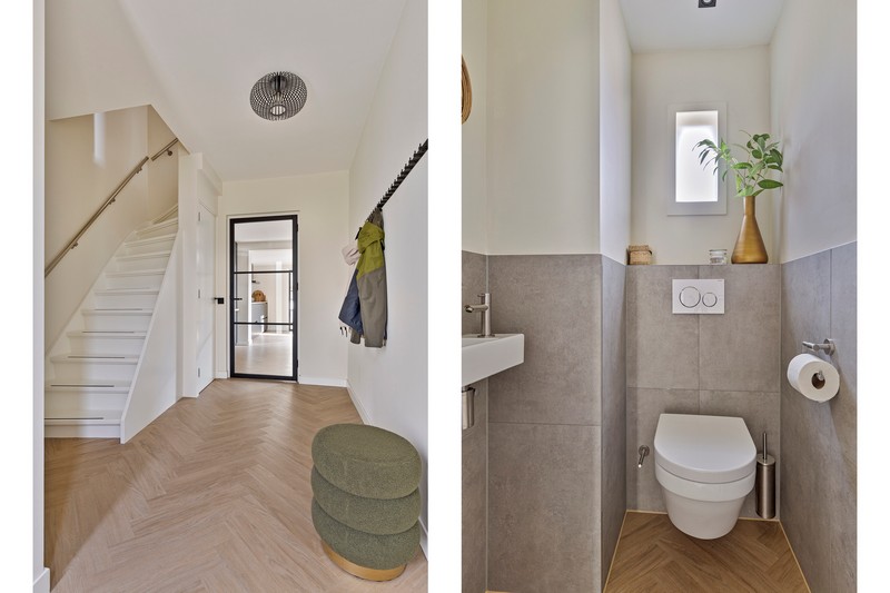 Via de voorkant van de woning kunnen we naar binnen. Kom je mee? In de hal vind je een mooi afgewerkte toiletruimte in een lichte kleurstelling met wandcloset en fontein. Onder de trap vinden we de toegang naar de volwaardige provisiekelder onder de hal. De woonkamer is écht ruim en heeft een prachtige lichtinval dankzij de raampartijen aan de oost-, zuid- en westgevel van de woning. Daarnaast is de woonkamer, evenals de hal en de keuken, voorzien van een speelse PVC visgraatvloer met vloerverwarming, moderne steellook deuren en een afwerking in lichte kleurstelling. De sfeervolle moderne haard is perfect en zorgt voor gezellige, warme avonden met vrienden en familie. Laten we ook de riante schuifpui niet vergeten waardoor binnen en buiten één zijn.