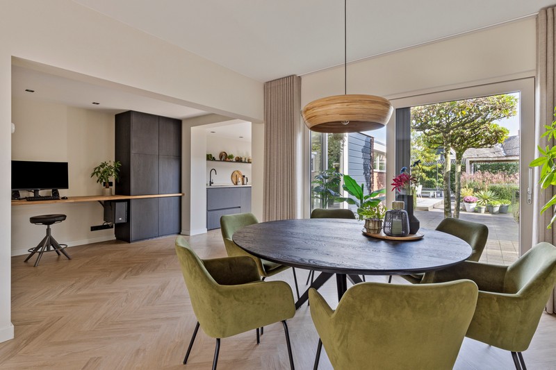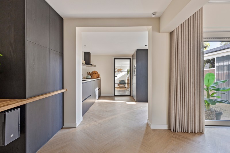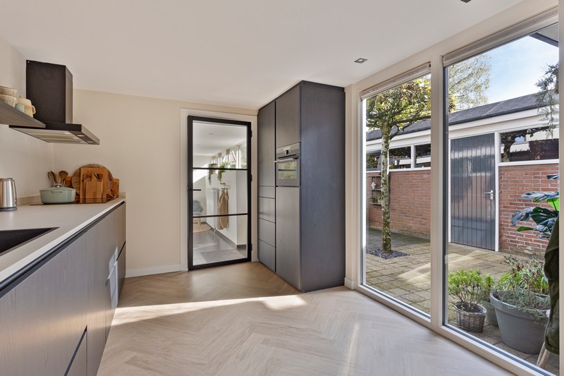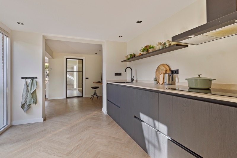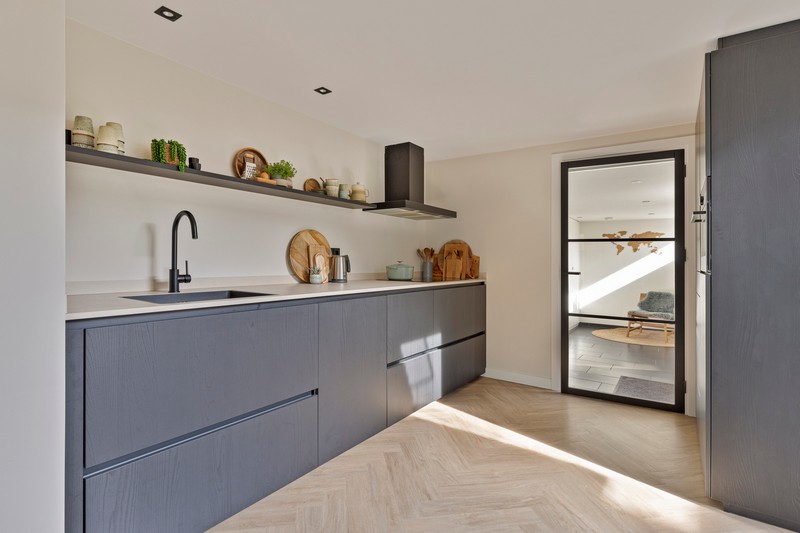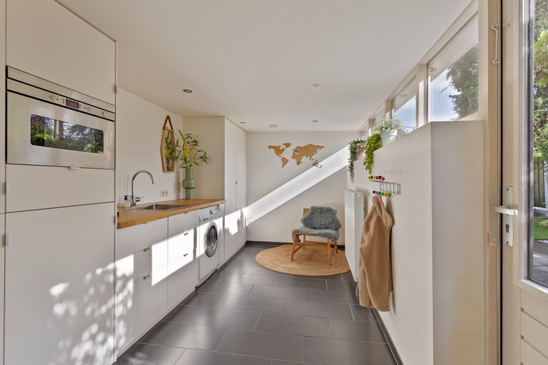 Aan de achterkant van het huis ligt de keuken. Er is een moderne inbouwkeuken aanwezig en een wandkast met verschillende inbouwapparatuur. Hierbij kun je denken aan een inductiekookplaat, afzuiging, koelkast, combi-oven/magnetron en vaatwasser. De keuken is afgewerkt met een Dekton aanrechtblad. Vanuit de keuken is er een doorgang naar de bijkeuken. Ook de bijkeuken is voorzien van een inbouwkeuken met extra kastruimte en apparatuur zoals een extra wasbak, koel-/vriescombinatie en combimagnetron. Ook de wasmachine vindt hier zijn plek. De buitendeur geeft toegang tot de gezellige tuin.