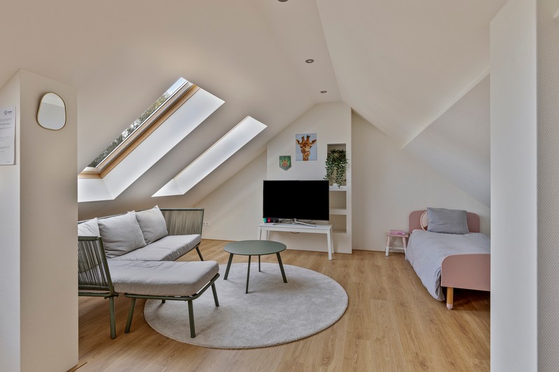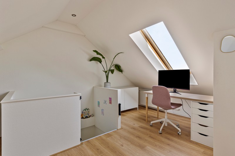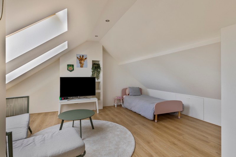 De bovenste verdieping is via een vaste trap bereikbaar. De zolder is in zijn geheel omgetoverd tot dé droom van elke puber! De slaapkamer is erg ruim en beschikt over 3 grote dakramen voor een optimale lichtinval.