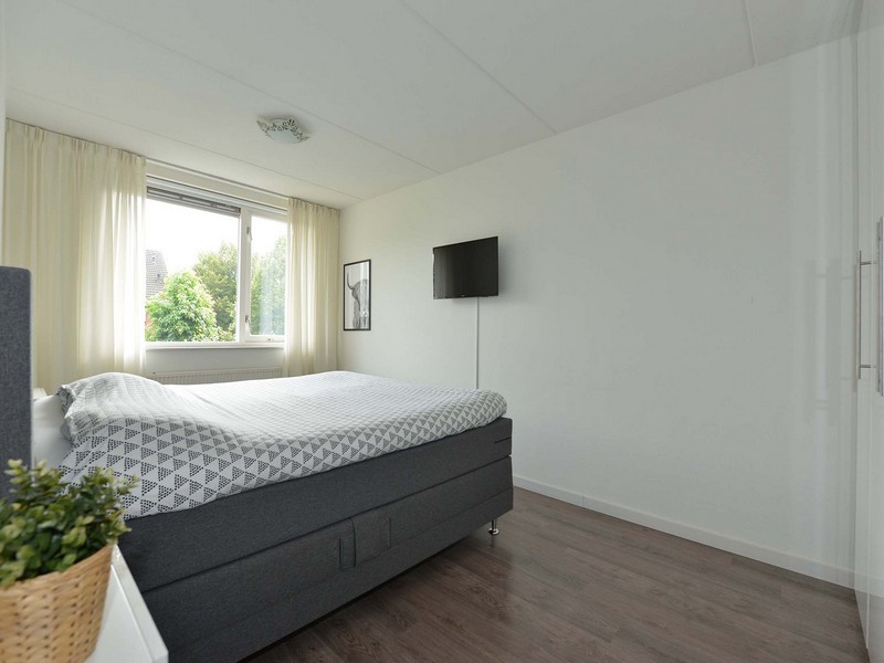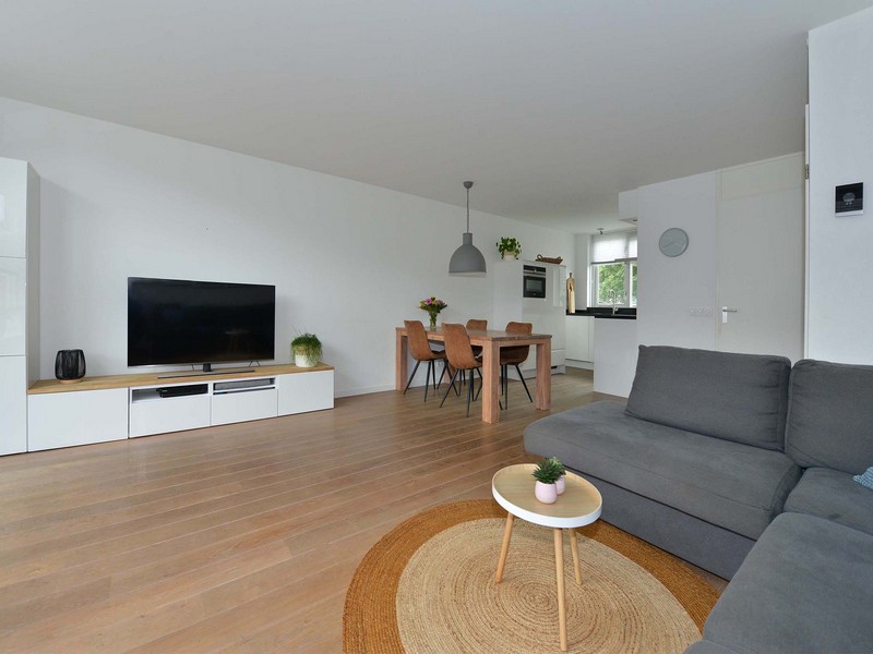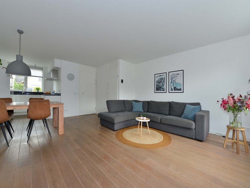 Via de hal met (vernieuwde) toiletruimte met zwevend toilet, meterkast en trapopgang komen we in de tuingerichte woonkamer. De vloer is voorzien van een massief eikenhouten vloer in white-wash en loopt door in de hal en keuken. De open keuken bestaat uit een witte hoogglans inbouwkeuken met kookplaat, afzuiging, combimagnetron, koelkast, vriezer en vaatwasser.