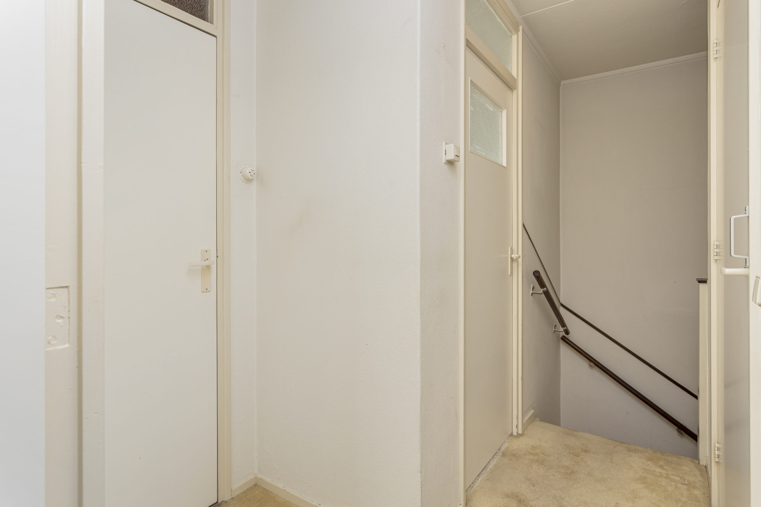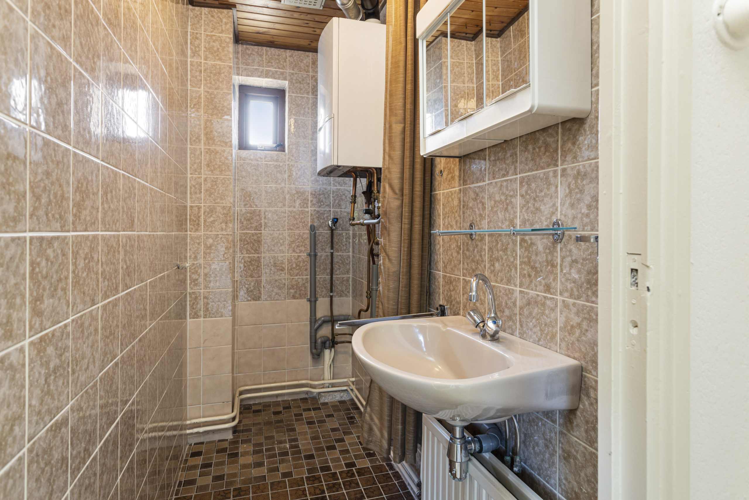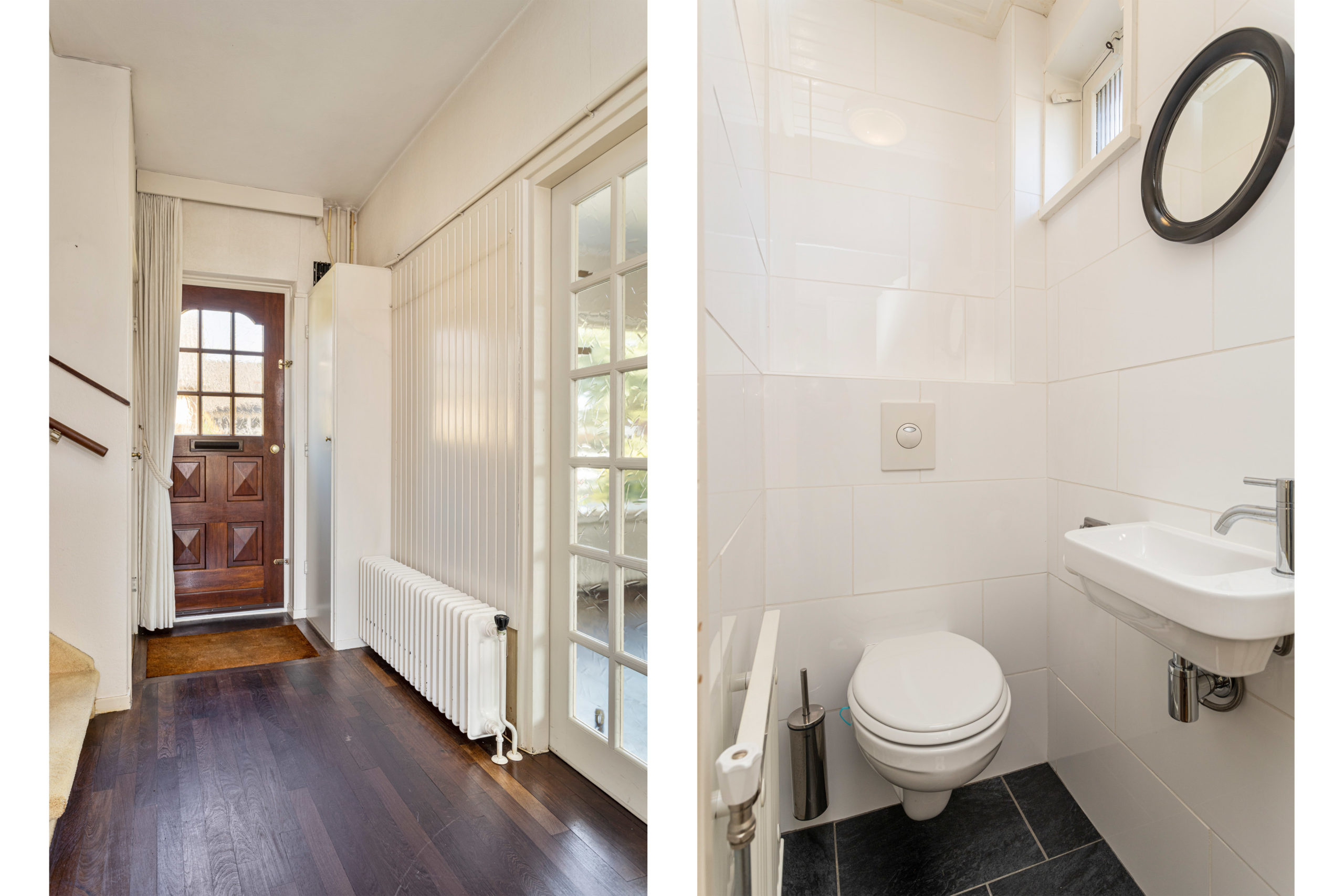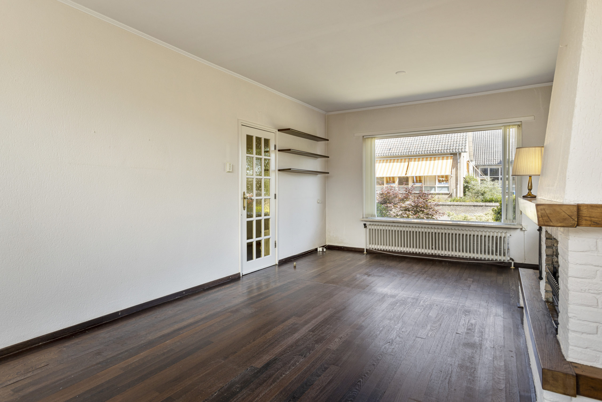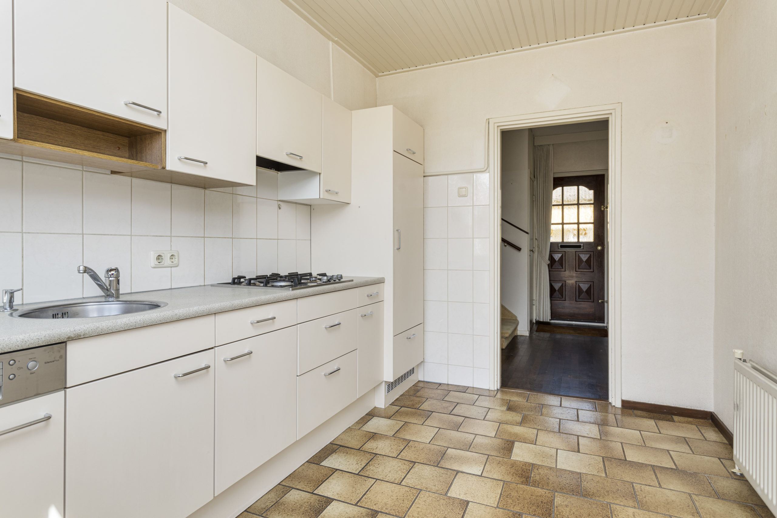 We komen binnen in de hal. Hier vinden we ook de toilet, meterkast en provisiekelder onder de trap. De volgende deur brengt u in de lichte doorzonkamer met parketvloer, grote ramen en openhaard op gas. De dichte keuken is voorzien van een lichte inbouwkeuken met gaskookplaat, afzuiging, koelkast en vaatwasser. De muur tussen woonkamer en keuken doorbreken zorgt voor een fijne open ruimte maar het is uiteraard ook een optie om aan de achterzijde uit te bouwen.