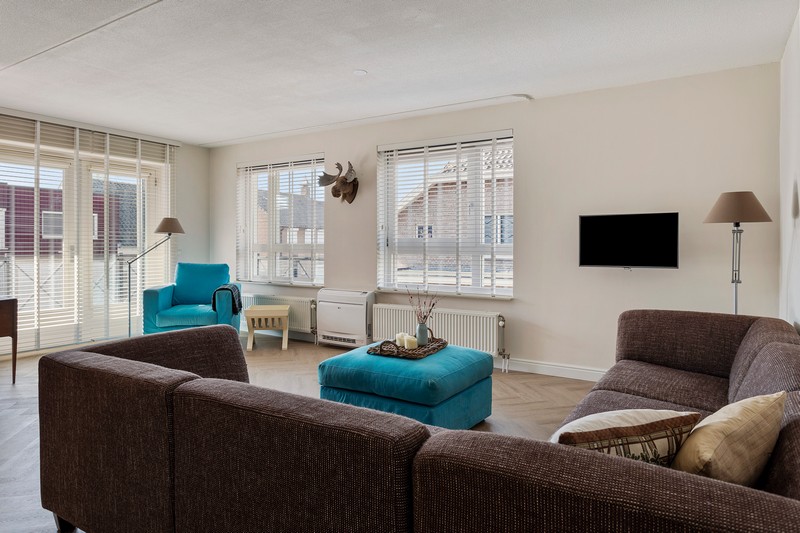 Met de lift naar de eerste verdieping. Eenmaal binnen bevindt u zich in de hal met garderobe. Vervolgens stapt u de heerlijk lichte woonkamer in waar meerdere zithoeken mogelijk zijn om te ontspannen. Dubbele openslaande deuren geven toegang tot het grote overdekte balkon aan de zijde van de Molenstraat waar u de gehele dag kunt genieten van de zon of zelfs op een regenachtige dag droog kunt zitten.