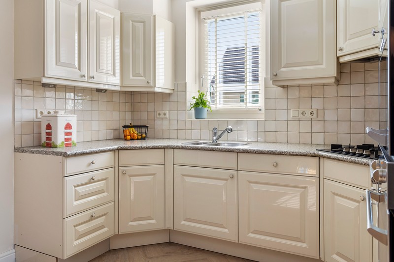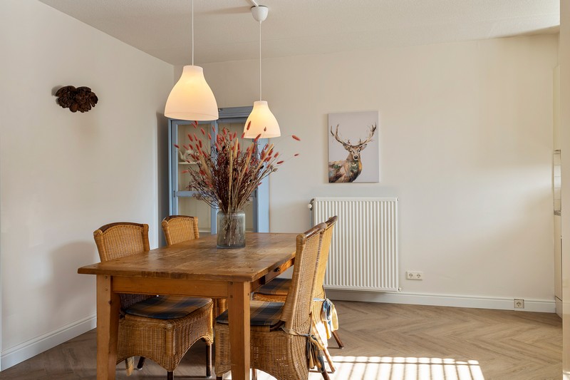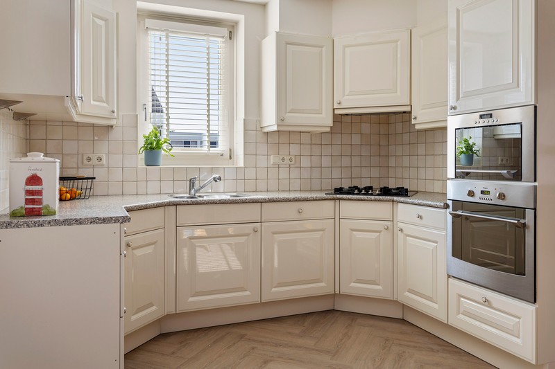 De lichte woonkamer is voorzien van airco en luxe houten lamellen. Aan de straatzijde/zijkant is de zithoek ingericht. De open keuken biedt plek voor een grote eettafel. De mooie open keuken, in landelijke stijl, is uitgevoerd in witte hoogglans. De keuken is uitgerust met een kookplaat, oven, magnetron en vaatwasser. Direct naast de keuken is een ruime inpandige berging gelegen. Hier heeft u ruimte voor een wasmachine, een extra koelkast en de nodige bergruimte.