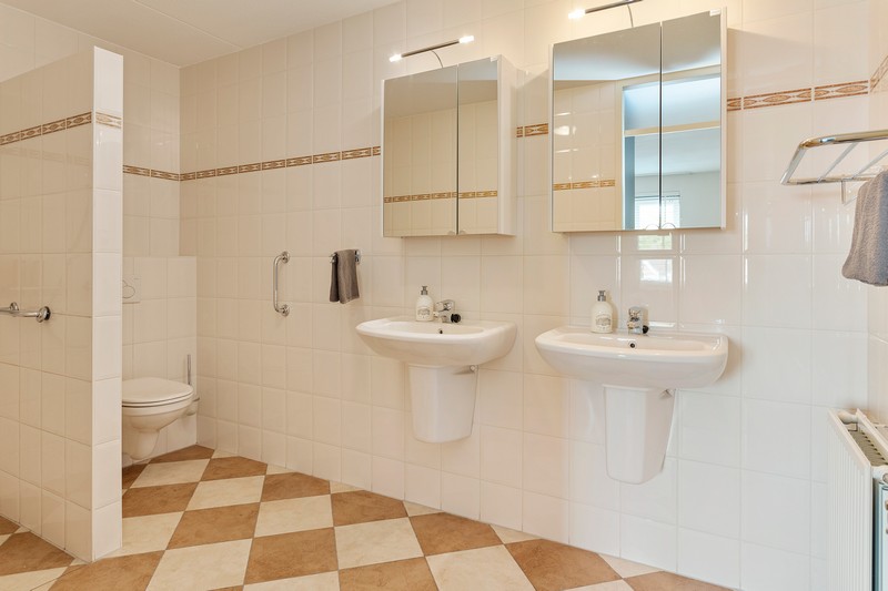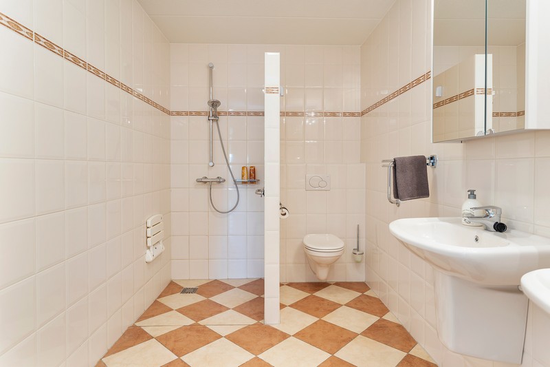 De ruime badkamer is voorzien van vloerverwarming. Deze is ingericht voor de toekomst of iemand met een beperking. De inloopdouche is uitgerust met opklapbare douchestoel, beugels, zwevend toilet en twee wastafels. In de hal bevindt zich een gastentoilet met fonteintje.