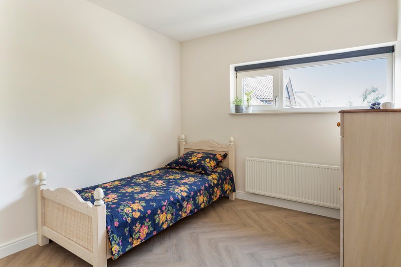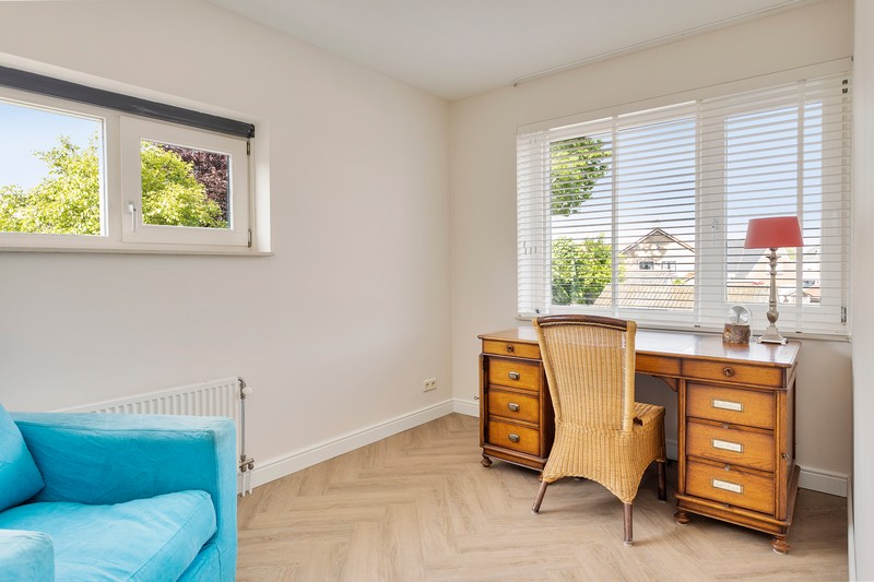 Via de woonkamer bereikt u een tweede hal, gelegen aan de achterzijde. Aan deze hal grenzen drie slaapkamers, een badkamer en apart gastentoilet. De hoofdslaapkamer is licht, ruim en uitgerust met een luxe kastenwand met schuifdeuren en twee kledingliften. Voor het raam zit een elektrisch rolluik. De royale badkamer is zowel vanuit de hal als vanuit hier rechtstreeks bereikbaar. De tweede slaapkamer is ook ruim en voorzien van elektrische rolluiken. Slaapkamer nummer drie is iets kleiner.