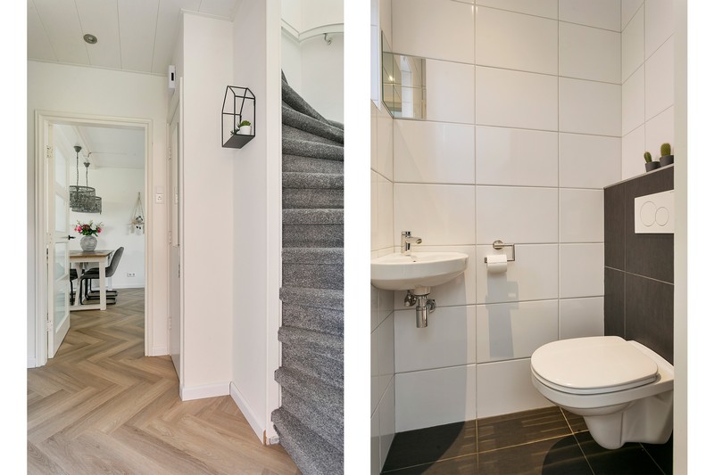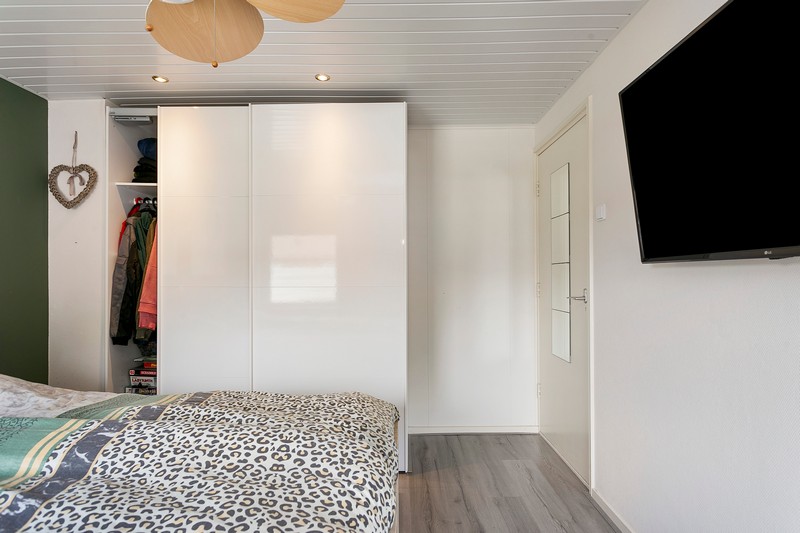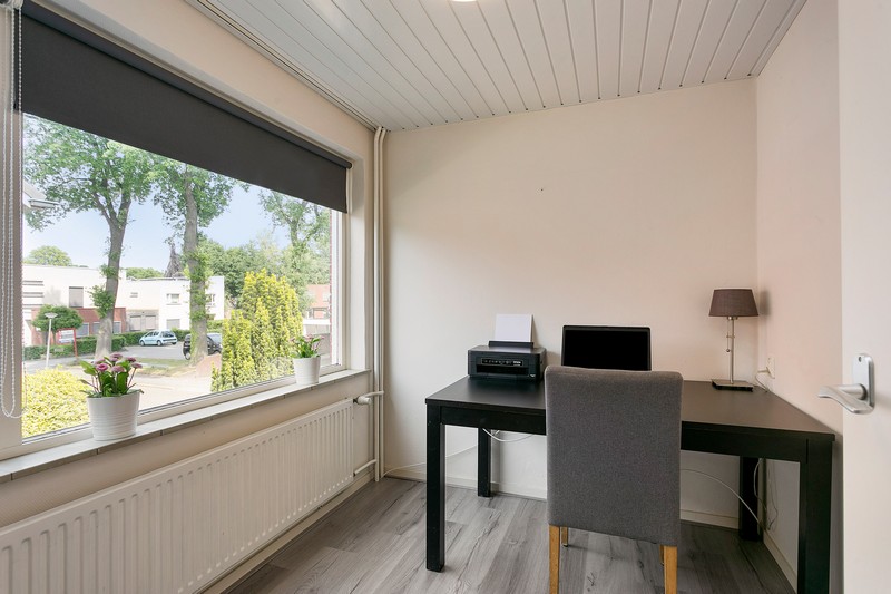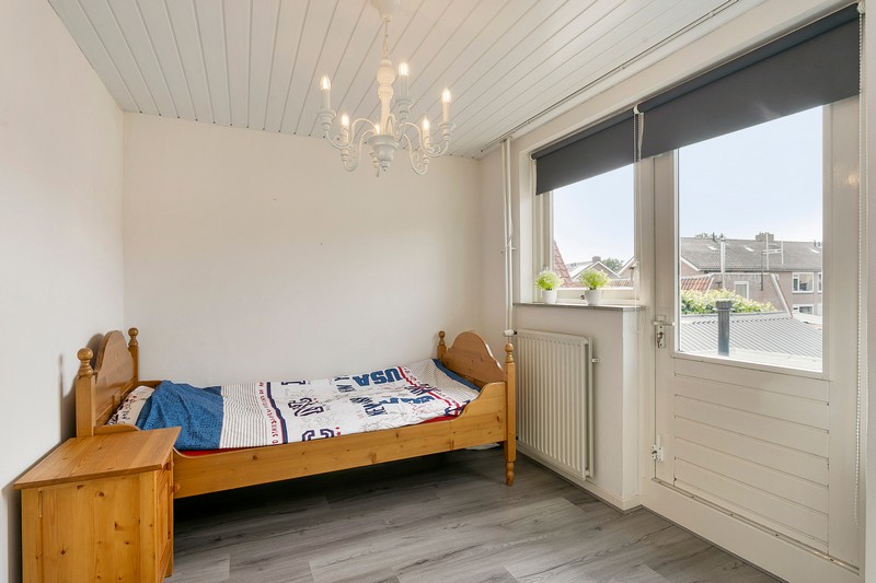 Verder telt de woning drie slaapkamers op de eerste verdieping. De grootste ervan is aan de voorzijde gelegen. Aan de achterzijde is een ruime slaapkamer met een openslaande deur naar het dakterras. De derde slaapkamer is nu ingericht als hobbykamer. De badkamer is praktisch ingericht met een wastafel en een inloopdouche.