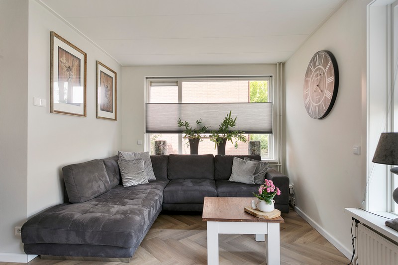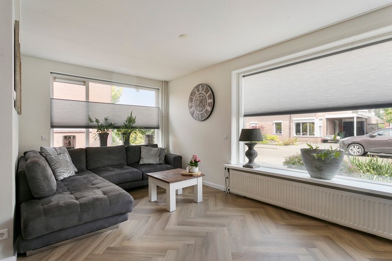 We gaan op ons gemak een kijkje nemen en parkeren de auto op de oprit voor de woning. Handig een eigen parkeerplek met ruimte voor twee auto’s. Eenmaal door de voordeur komt u in de hal, waar de meterkast, het moderne toilet met fontein en garderoberuimte is gesitueerd. De volgende deur brengt je in de lichte en L-vormige woonkamer met een fraaie kwalitatief hoogwaardige pvc-vloer in visgraatstructuur De rust en ruimte komen prettig over. De ramen zijn voorzien van rolluiken.