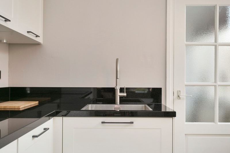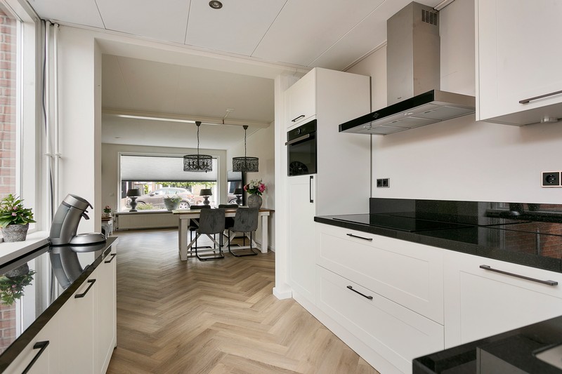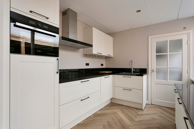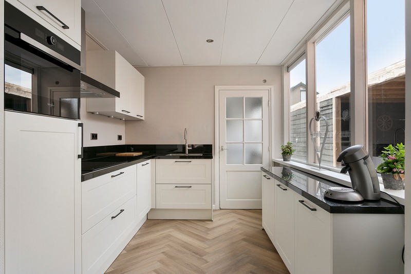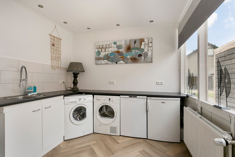 De moderne lichte keuken is voorzien van een granieten blad en achterwand, inductie kookplaat, afzuigkap, combimagnetron, kokend-waterkraan, koelkast en vaatwasser. Vanuit de keuken is er toegang tot de bijkeuken welke ook is voorzin van een groot werkblad met spoelbak. Daaronder staan de wasmachine en wasdroger evenals een extra koelkast en vriezer.