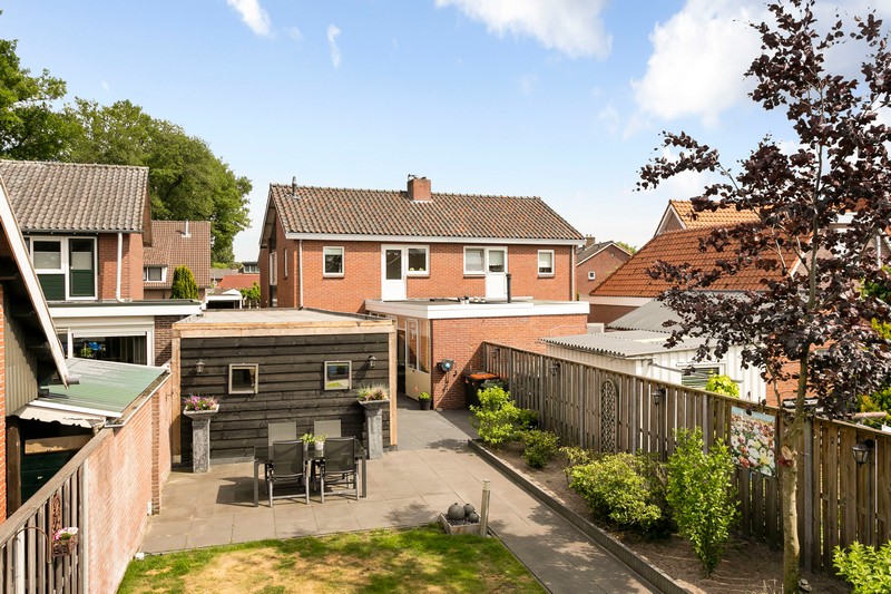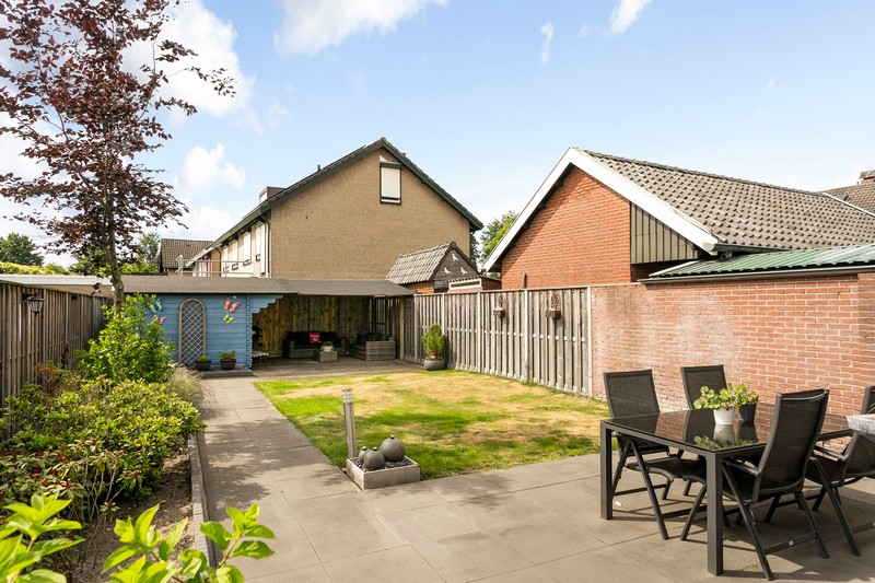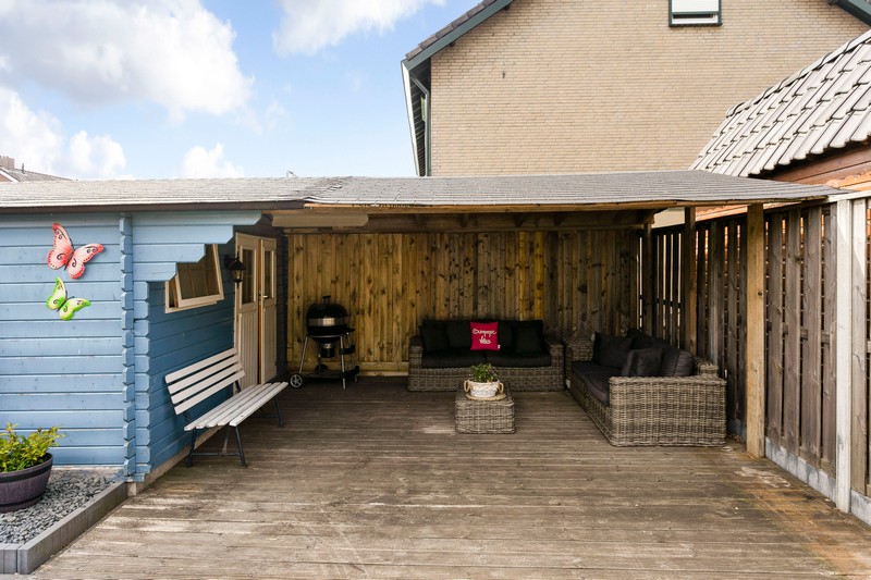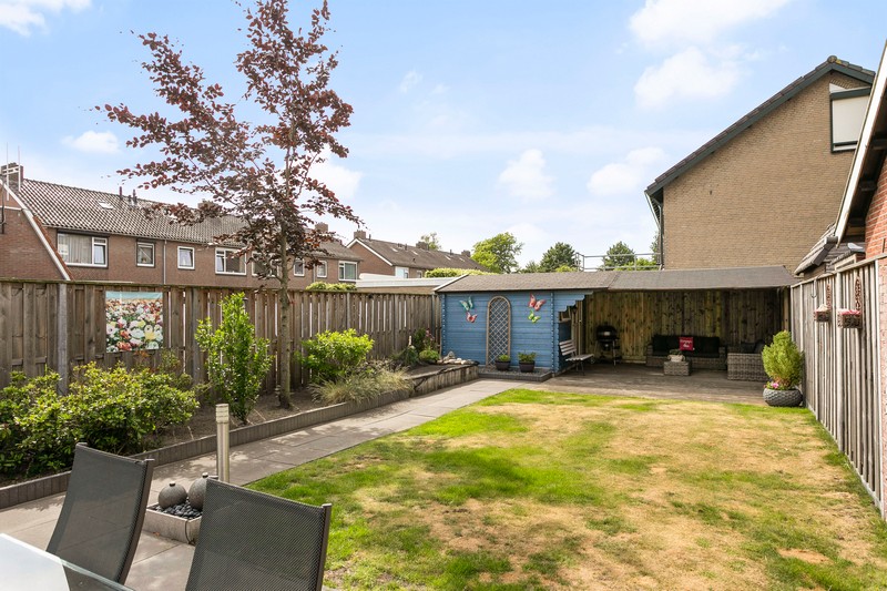Vanuit de bijkeuken stap je naar buiten. De achtertuin met een diepte van maar liefst 20 meter is onderhoudsvriendelijk. De achtertuin is bovendien voorzien van een heerlijke overkapping, waar het tot in de late uurtjes goed vertoeven is. En aangezien er aan ruimte geen gebrek is kunt u altijd een plekje vinden voor de trampoline, zandbak of zwembad.