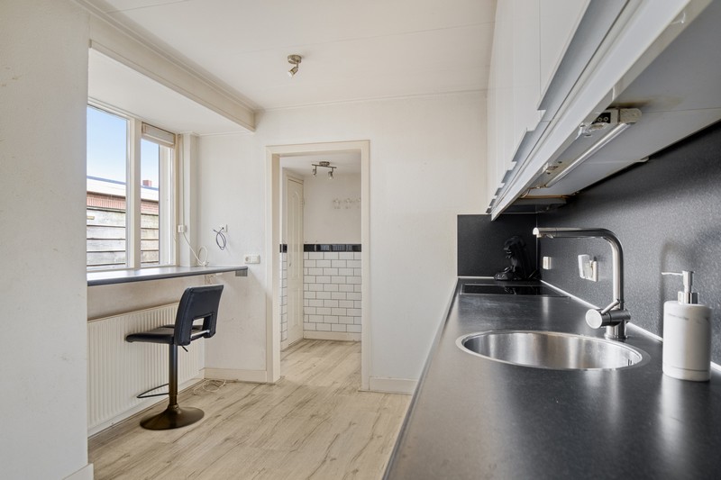 De aangrenzende ruime keuken is voorzien van een moderne inbouwkeuken in hoekopstelling met inductie kookplaat, afzuiging, vaatwasser, koelkast en combimagnetron. De kelderkast is toegankelijk vanuit de keuken. Via de achterentree kom je in de badkamer op de begane grond die voorzien is van een inloopdouche, toilet en wastafel. Aangrenzend is de slaapkamer op de begane grond gelegen van waaruit je ook de achtertuin kunt bereiken.