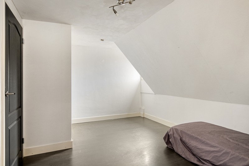 Op de 1e verdieping zijn twee slaapkamers die voorzien zijn van een laminaatvloer. Ook vindt u er de tweede badkamer uitgerust met een strakke, moderne wastafel en een douchecabine. Donkergrijze vloertegels maken het helemaal af. Op de 2e verdieping bevindt zich een zolderberging.