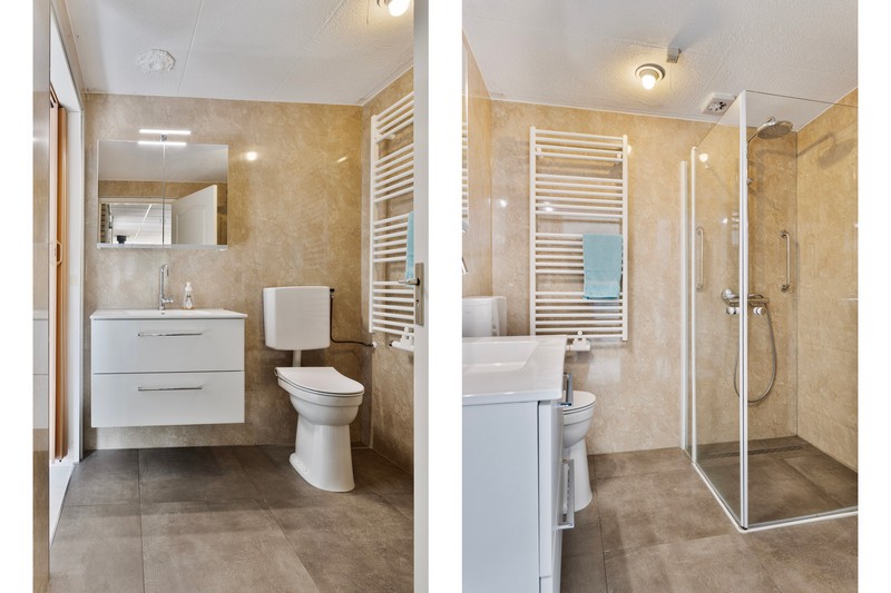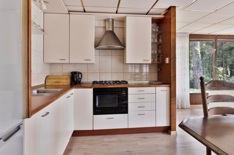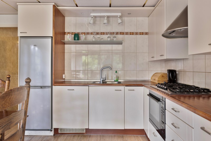 De half open keuken met keuken in hoekopstelling is voorzien van 5-pits gaskookplaat, afzuiging, combimagnetron, koelkast en vaatwasser. In de hoofdbouw bevindt zich ook de gemoderniseerde badkamer met wastafelmeubel, inloopdouche en toilet.
