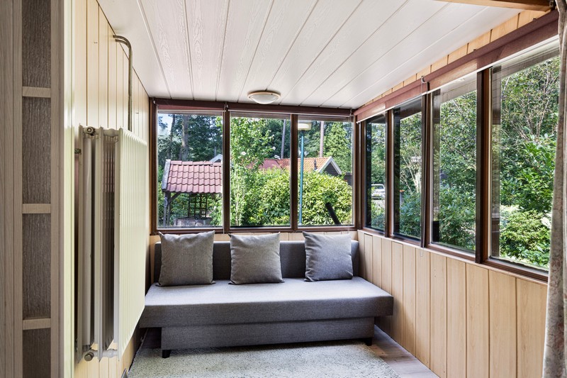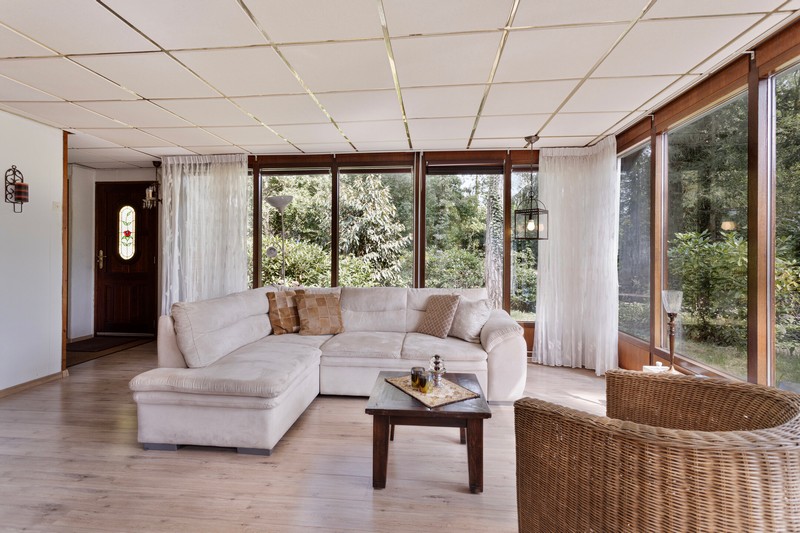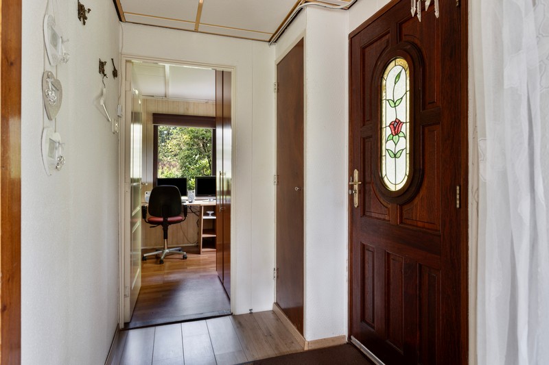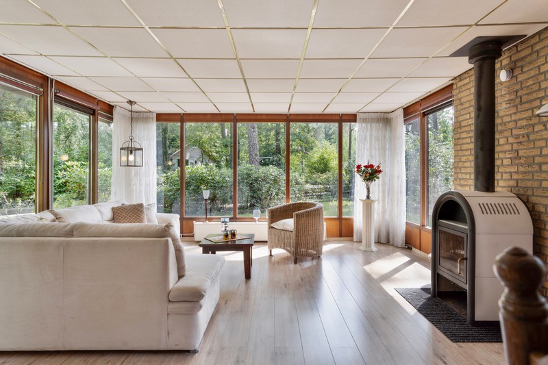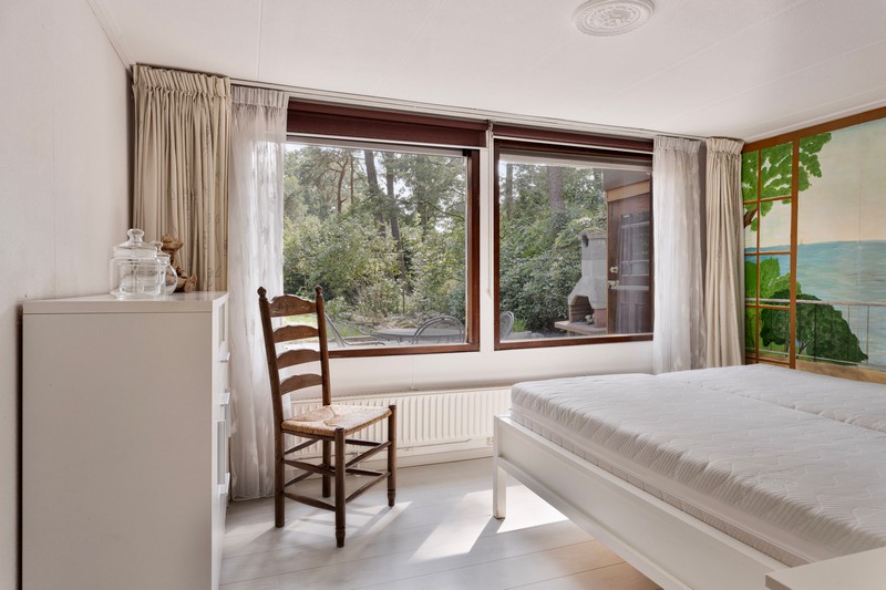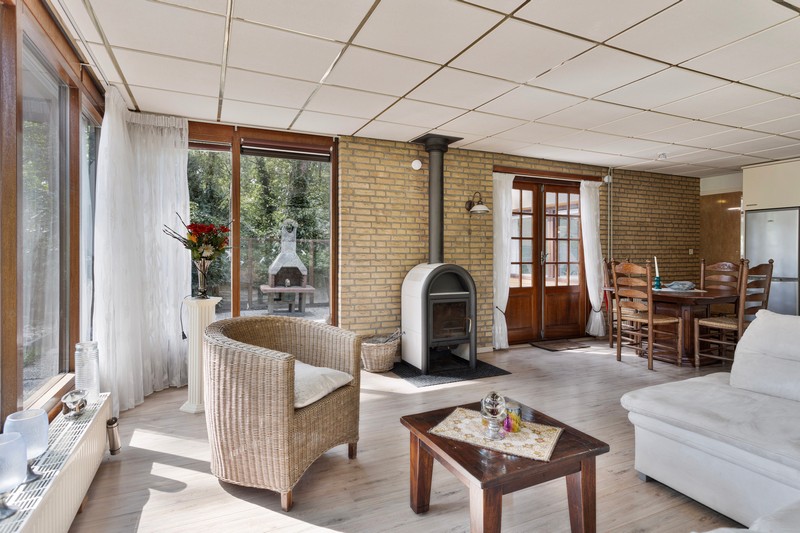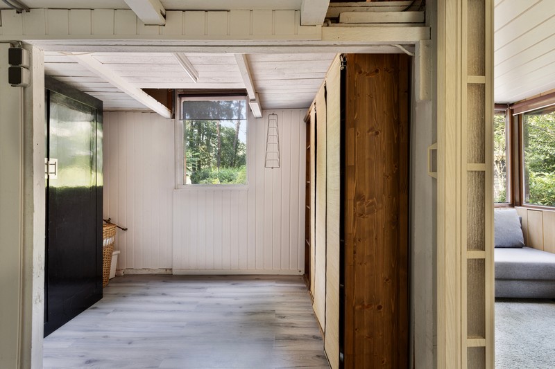 Aan de rechterzijde van de entree vinden we een slaapkamer. Vanuit de slaapkamer is ook de zolder bereikbaar die in het verleden als slaapplek heeft gediend. Aan de linkerzijde vinden we een ruime woonkamer met sfeervolle houtkachel, tuindeuren naar een ruim terras en veel glas. Aan 3 zijden kijk je uit over de fraaie natuur rondom de bungalow.