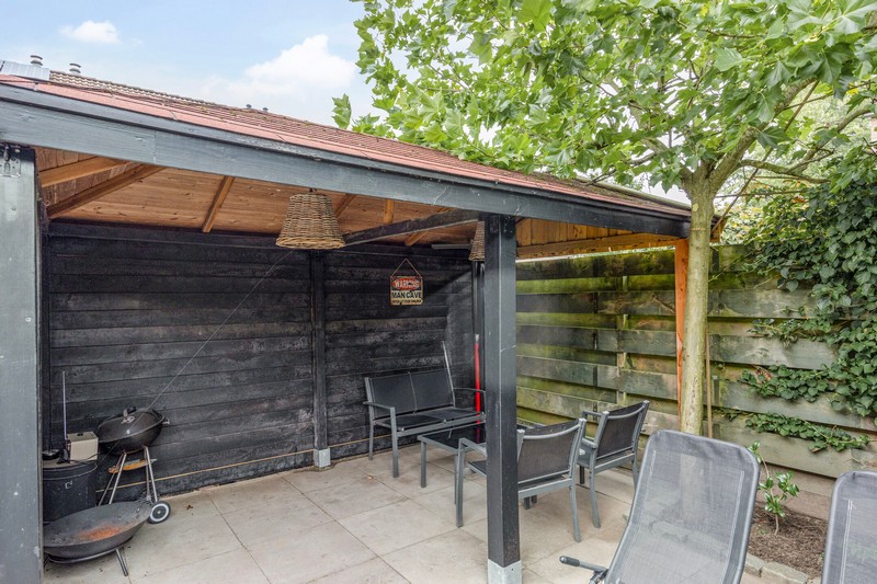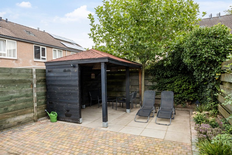 De onderhoudsarme tuin met een overkapping is een fijne plek voor een zomerse barbecue met vrienden en familie, lekker zonnen of even niks doen. De tuin is via een pad aan de zijkant achterom te bereiken.