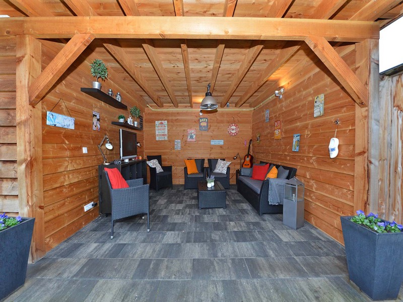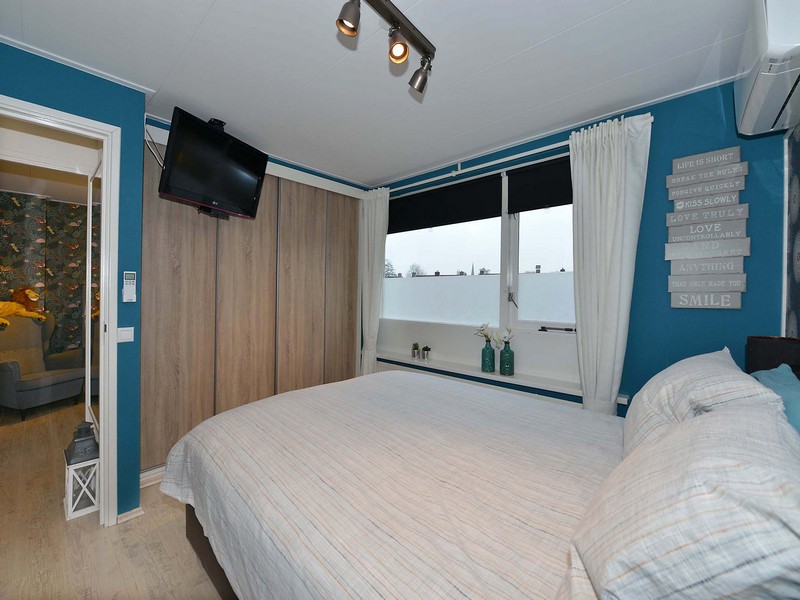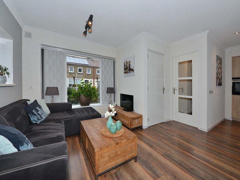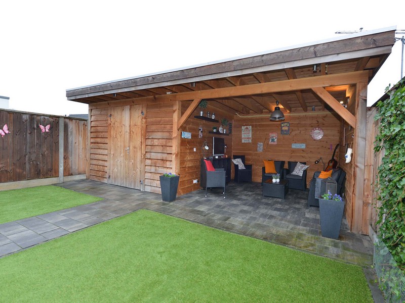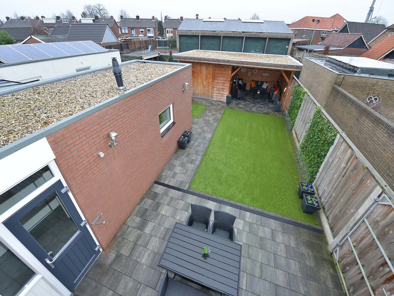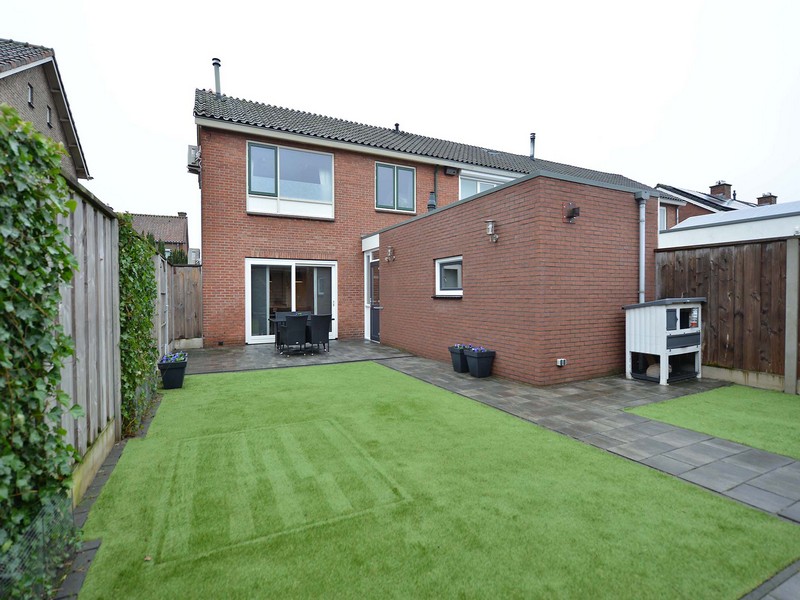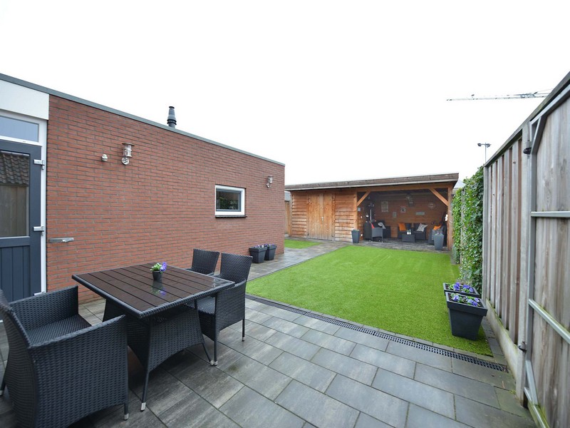 Niet alleen aan de achterzijde maar ook aan de voorzijde is veel aandacht aan de tuin besteed. De makkelijk te onderhouden tuin is middels een schutting omsloten en biedt volop privacy. Mocht het op de hete zomerdagen van tegenwoordig te warm zijn in de zon dan kun je prima vertoeven in de bijzonder ruime overkapping die in één geheel is opgetrokken met een ruime tuinberging.