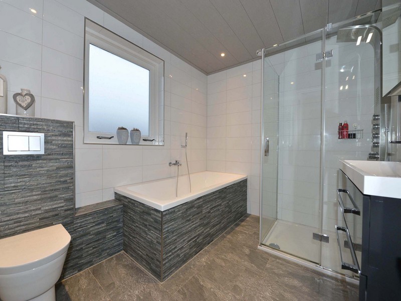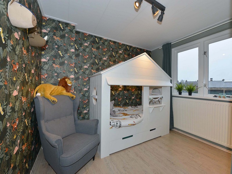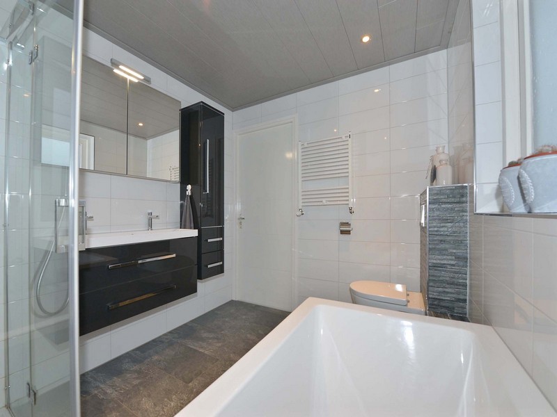 Via de hal, met garderobenis en toilet, gaan we naar de 1e verdieping. De moderne badkamer in fraaie kleurstelling beschikt over een ruime inloopdouche, ligbad, handig 2e toilet en dubbel wastafelmeubel. Verder vinden we 3 slaapkamers op de verdieping waarbij de ouderslaapkamer is uitgerust met een schuifkastenwand. De bergzolder is middels een vlizotrap te bereiken.