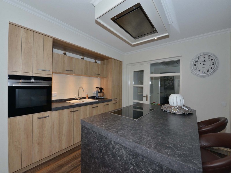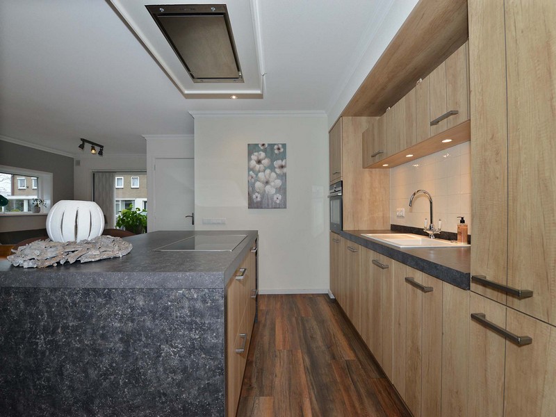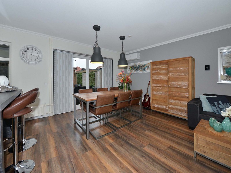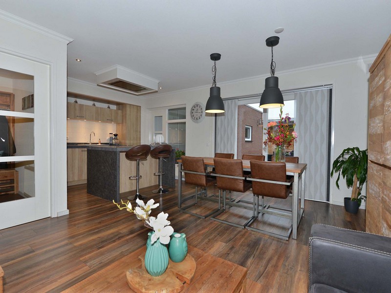 Als we via vervolgens de woonruimte betreden valt direct op hoe licht het is. Ramen op de oost, zuid en westzijde zorgen de hele dag voor zonlicht in de woonvertrekken. De fraaie en eveneens moderne keuken is voorzien van een kookeiland met inductiekookplaat en afzuiging. In het andere deel vinden we een koelkast, combioven en vaatwasser. De woonkamer kijkt uit op de straat aan de voorzijde en tuin aan de achterzijde welke via de grote schuifpui eenvoudig te bereiken is.