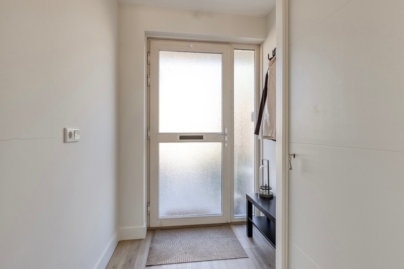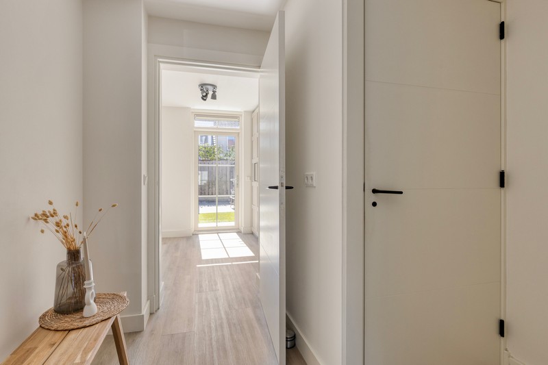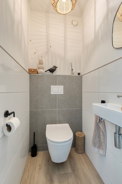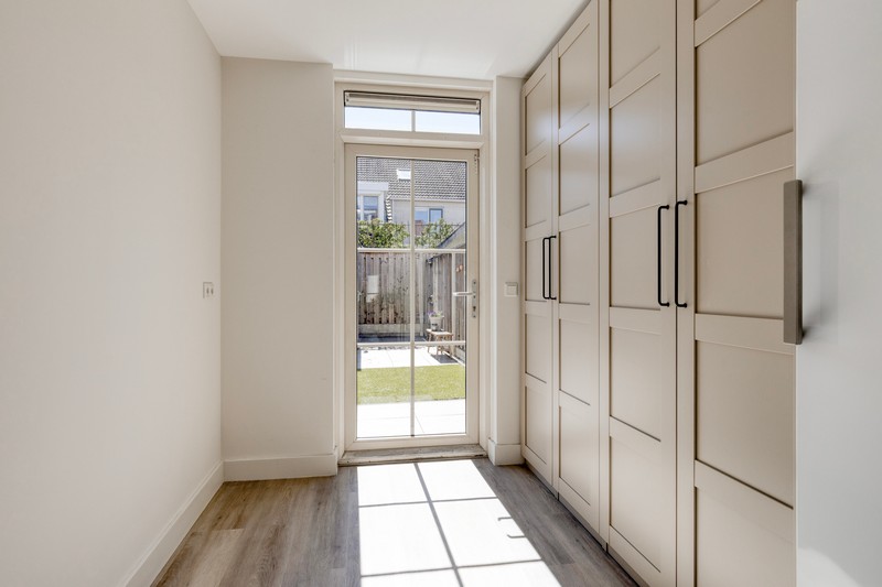 Aan de achterzijde bevindt zich de hal met trapopgang (en daaronder een fijne trapkast), modern hangtoilet en de achterentree/bijkeuken. Een ideale ruimte voor extra kastruimte, vriezer of je witgoed!