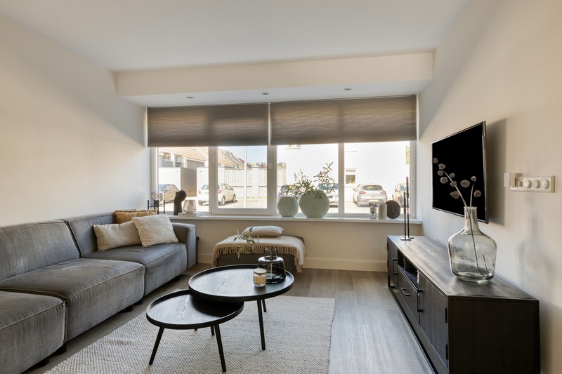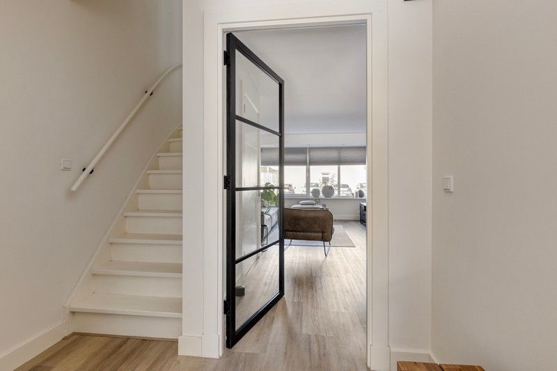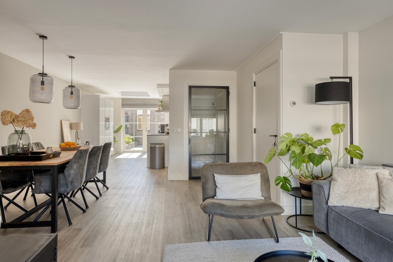 Aan de voorzijde komen we binnen in de hal met meterkast en garderoberuimte. Als we doorlopen naar de woonkamer valt direct de sfeervolle en ruime woonkamer op. De combinatie van modern, strakke afwerking en prettige lichtinval zorgt voor een eigentijdse en warme uitstraling.
