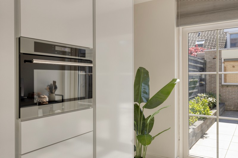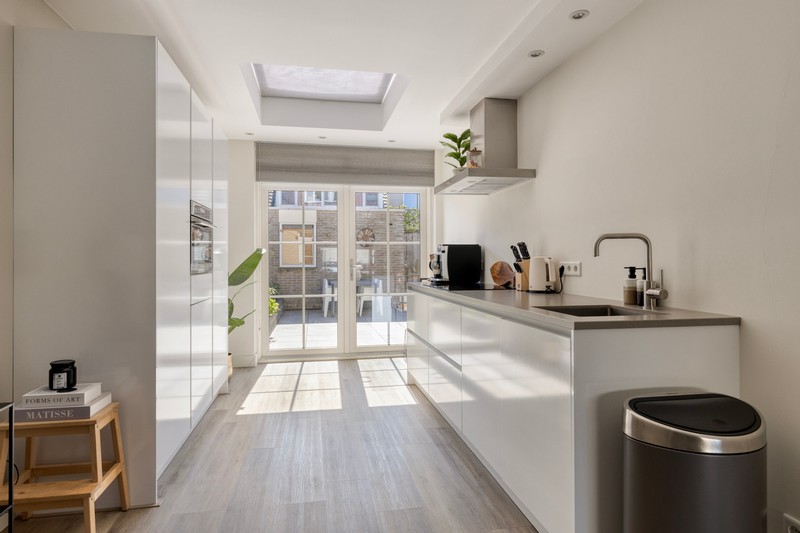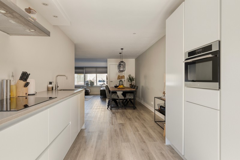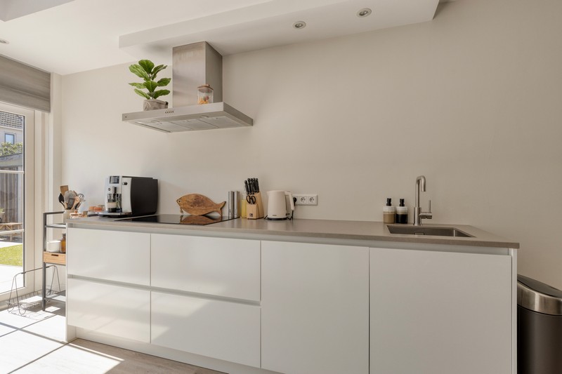 De moderne keuken aan de achterzijde sluit hier naadloos op aan. De keuken is modern uitgevoerd en voorzien van een inductiekookplaat, afzuiging, combimagnetron, koelkast, vaatwasser en aan beide zijden en volop werk- en bergruimte om heerlijke diners te bereiden. Een fijne plek voor de enthousiaste thuiskok!