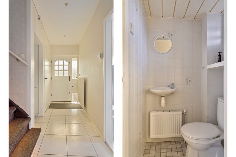 Bij binnenkomst word je verwelkomd in de ruime hal met een netjes afgewerkt toilet voorzien van fonteintje, de meterkast, een handige garderobe en de trapopgang naar de bovenverdieping.