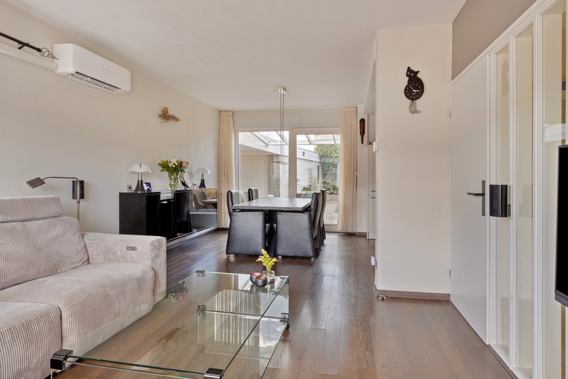 Wat gelijk opvalt als je de woning binnenstapt is de hoeveelheid lichtinval. Dit komt mede door de grote raampartijen aan zowel de voor-/ als achterkant van de woning. Aan de voorzijde van de woning is een gezellige zithoek gecreëerd waar even kunt bijkomen en kunt genieten van de rust en het uitzicht na een lange werkdag.