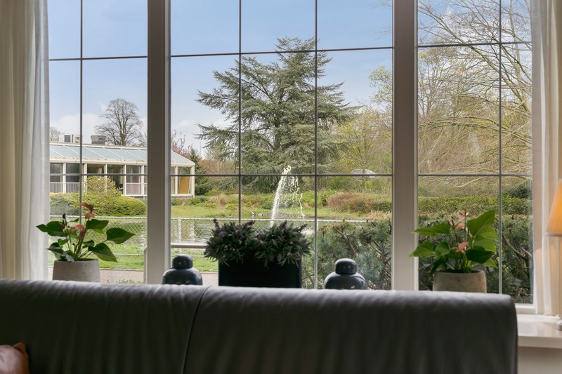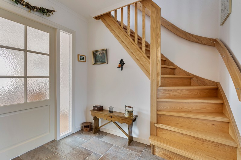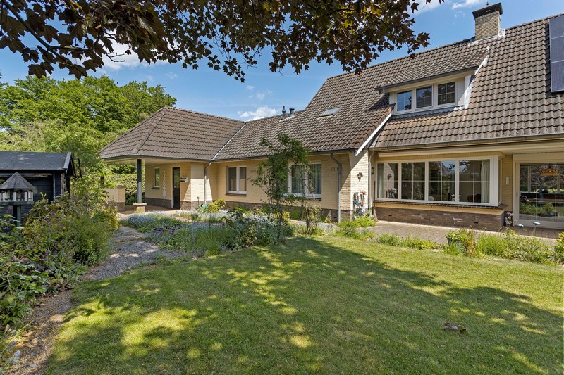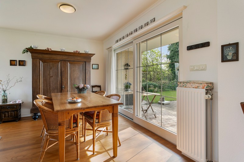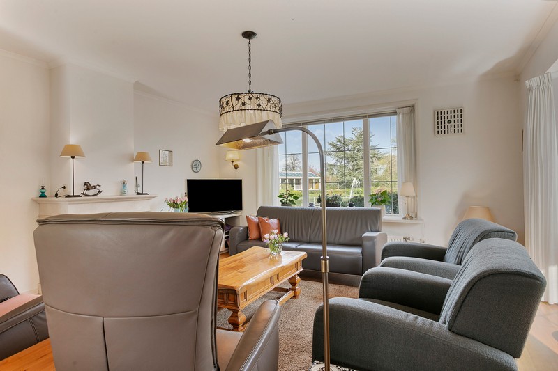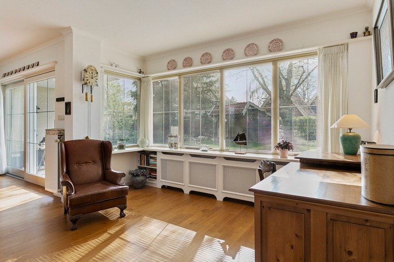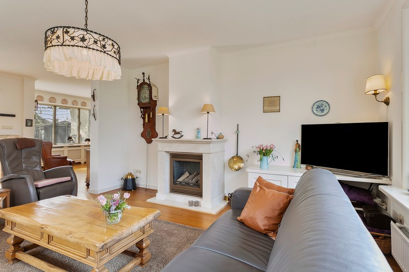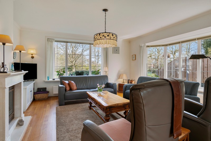 Via de entree met voorportaal betreden we de royale woonkamer. Direct vallen een aantal zaken op. De grote raampartijen en de schuifpui zorgen voor veel lichtinval, de mooie houtenvloer en de gashaard heeft een chique uitstraling. Het uitzicht? Dit is de plek waar wonen en natuur samensmelten! Wat een heerlijke plek om te vertoeven.