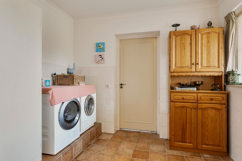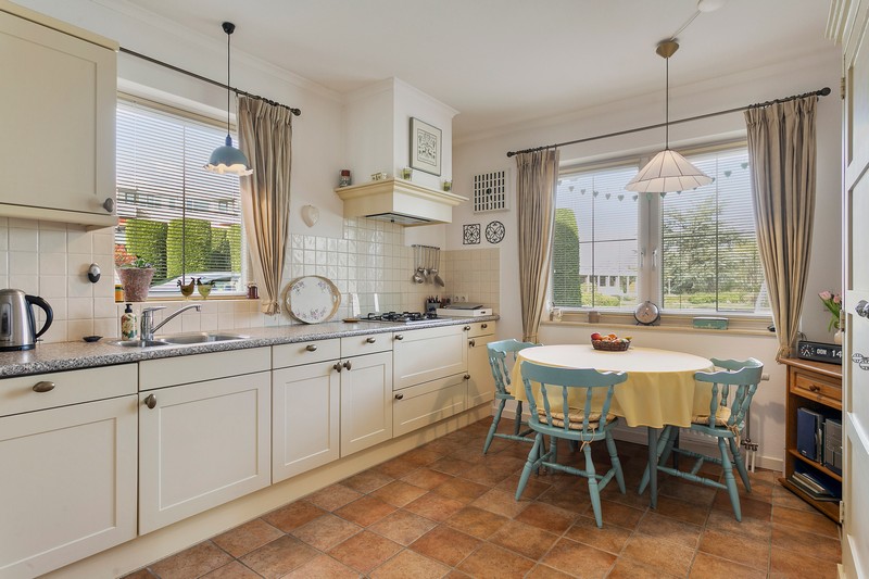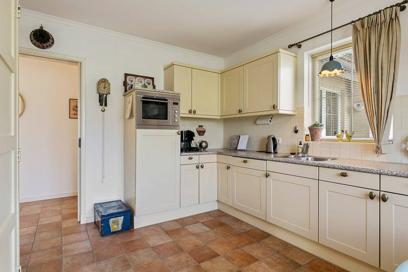 De ramen in de keuken, aan de voorzijde, zorgen voor een heerlijk uitzicht en ontspanning terwijl je staat te koken achter je 4 pits gasfornuis. Verder is de keuken voorzien van een afzuigkap, combi- oven, koelkast en een vaatwasser. Via de bijkeuken komen we in de bijzonder ruime garage van maar liefst 38 m².