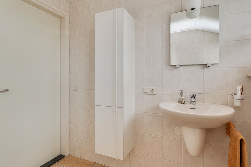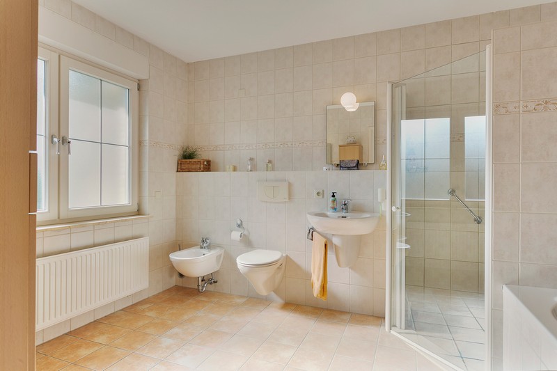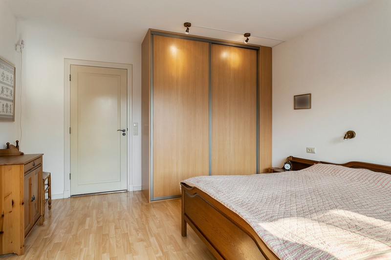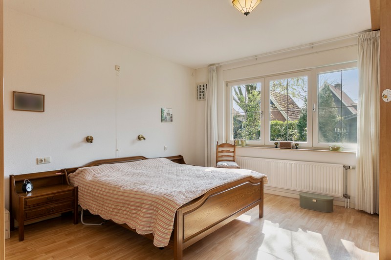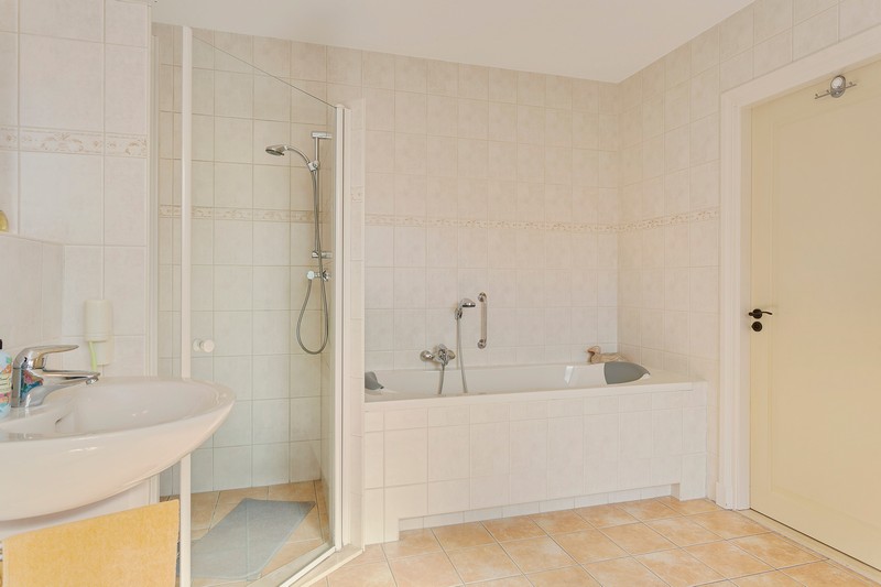 Aan de achterzijde van de woning vinden we een ruime slaapkamer met meer dan voldoende ruimte voor kasten en een royale badkamer met ligbad, douche, wastafel, toilet en bidet.