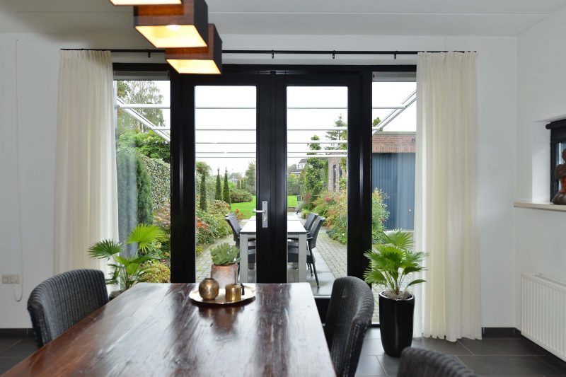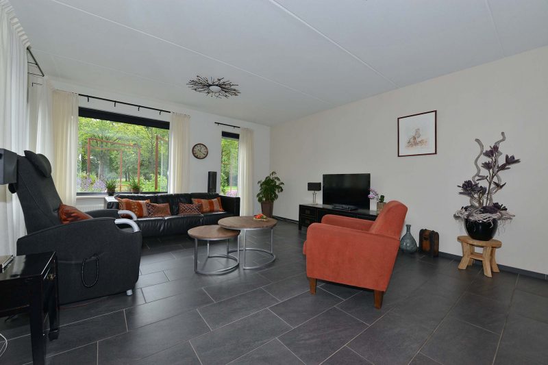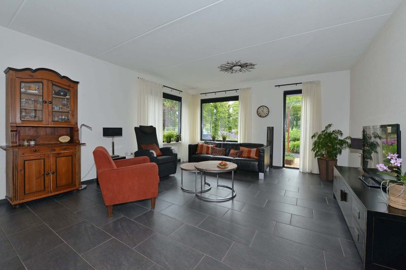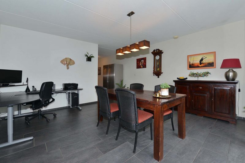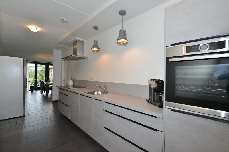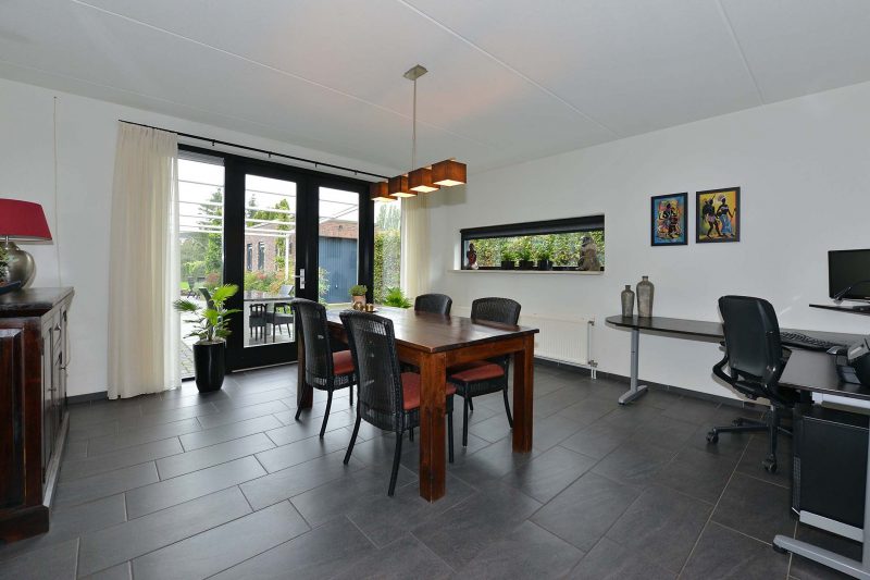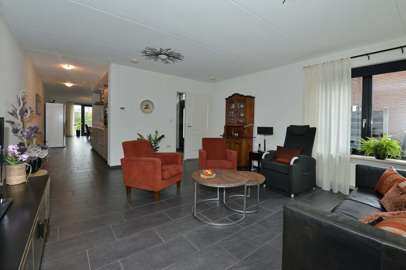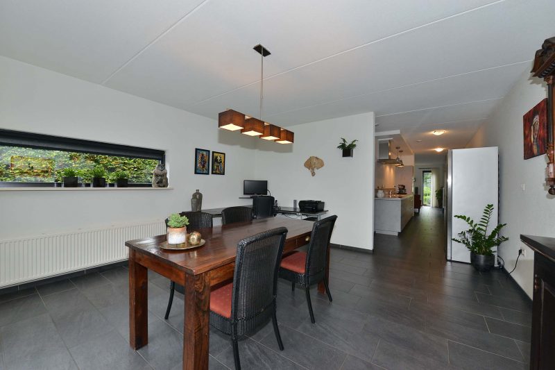 En verkijk u niet op de ruimte in de woning! Met een woonoppervlakte van meer dan 180 m² en een inhoud van meer dan 625 m³ kunnen we spreken over een bijzonder ruime eengezinswoning. En dat blijkt ook wel als we binnen zijn. Via de hal met meterkast en toilet komen we in de woonkamer aan de voorzijde van de woning. Fraaie antracietkleurige plavuizen lopen door tot in de keuken en de eetkamer met tuindeuren aan de achterzijde van de woning. De centraal gelegen keuken is voorzien van een luxe en moderne inbouwkeuken (2019) met inductiekookplaat, afzuiging, vaatwasser en oven. De bijkeuken dient tevens als achterentree van de woning en is direct naast de keuken gelegen. Via de achterentree bent u in een paar stappen bij de vrijstaande garage van 3m x 7m.