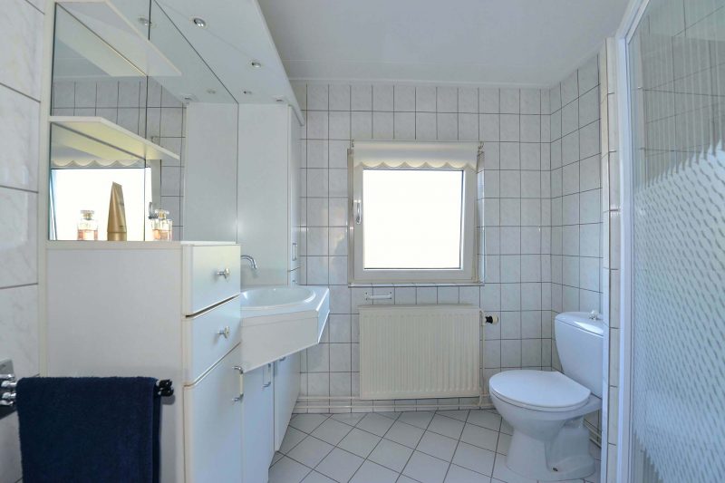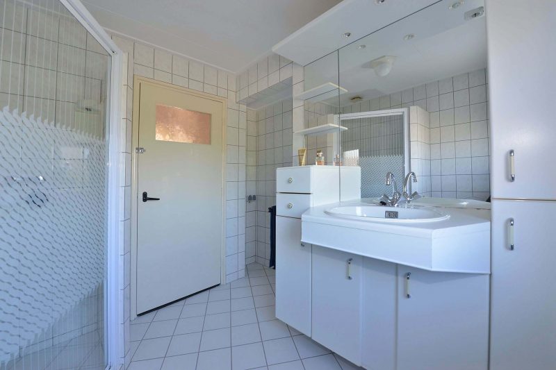 Op de verdieping vinden we 3 slaapkamers, alle voorzien van vaste kastruimte. De voormalige badkamer doet dienst als inloopkast maar u zou er ook een wasruimte van kunnen maken. De ouderslaapkamers heeft ook een balkon. De lichte badkamer biedt plaats aan een inloopdouche met glasdeur, wastafelmeubel en handig 2e toilet.