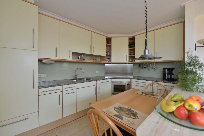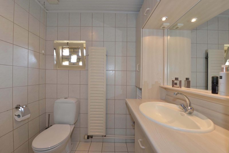 De inbouwkeuken is van alle gemakken voorzien waaronder een inductiekookplaat met afzuiging, koelkast, combimagnetron en uiteraard een vaatwasser. In de achterentree/bijkeuken vinden we een handig keukenblok met spoelbak en de aansluitingen voor de wasmachine.