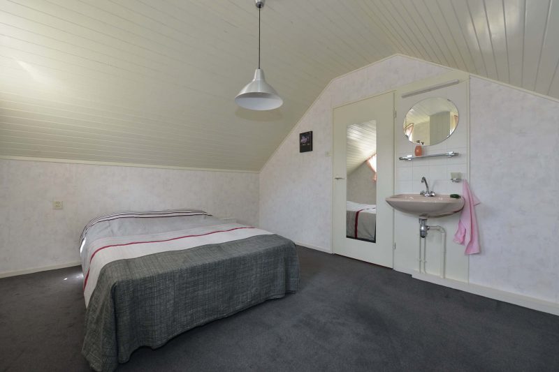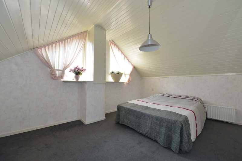 Op de 1e verdieping vinden we 3 van de 4 slaapkamers die alle voorzien zijn van vaste kastruimte. De licht betegelde badkamer biedt plaats aan een handig 2e toilet, wastafelmeubel en douchecabine. De 4e slaapkamer vinden we op zolder. Handig is de extra wastafel op deze slaapkamer. Onder de schuine kanten en op de voorzolder is voldoende bergruimte.