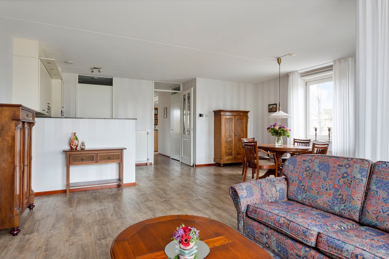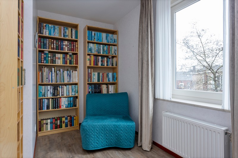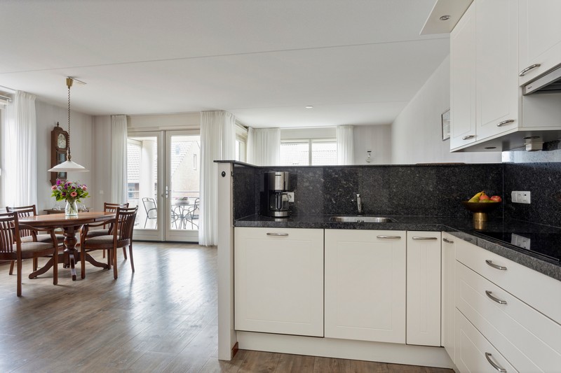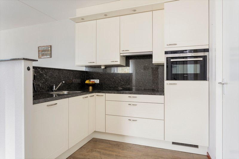 De lichte woonkamer, met ramen aan 2 zijden, is aan de straatzijde gelegen. De keuken is met een halfhoog muurtje afgescheiden van de woonkamer en bestaat uit een witte inbouwkeuken in hoekopstelling voorzien van granieten blad, inductiekookplaat, afzuiging, koelkast, combimagnetron en vaatwasser. Direct naast de keuken is de bijkeuken gelegen met vaste kastruimte. U kunt er eventueel ook de wasmachine kwijt.
