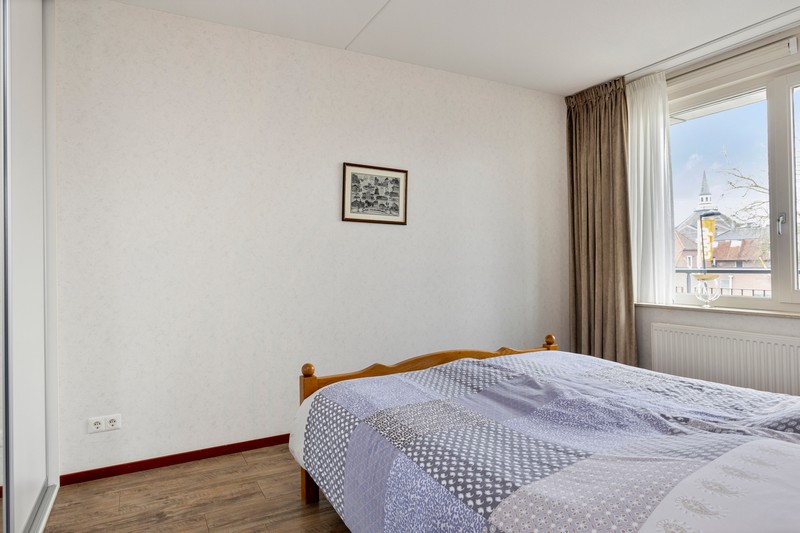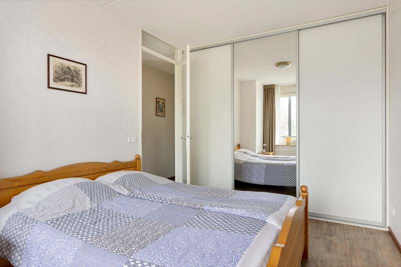 Eenmaal binnen is het voorbijkomende verkeer nauwelijks te horen. In het gehele appartement ligt dezelfde PVC-vloer met houtlook. De centraal gelegen hal heeft slaapkamers aan weerszijden. Beide slaapkamers zijn voorzien van een luxe kastenwand met schuifdeuren. Voor de gasten is er een aparte toiletruimte. De zeer royale en licht betegelde badkamer heeft een inloopdouche, vaste wastafel en hangtoilet.