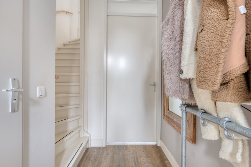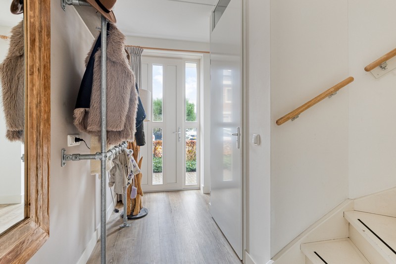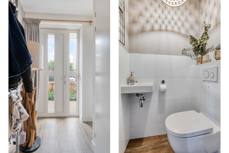 Je wordt bij binnenkomst ontvangen in een ruime hal met garderobe en toiletruimte. Ook bevindt zich hier de trapopgang naar de eerste verdieping en toegang tot de keuken en woonkamer.