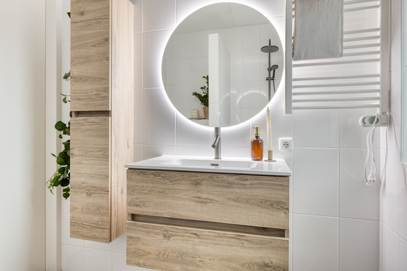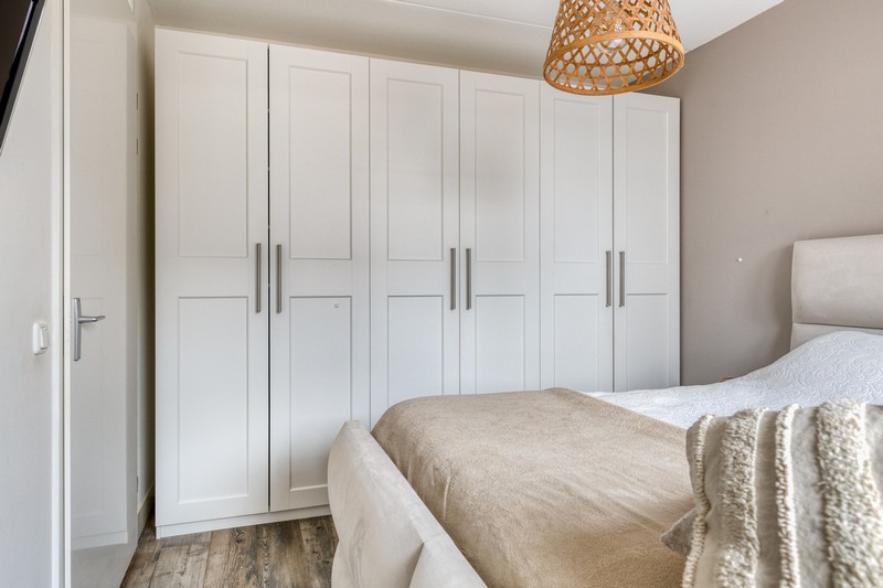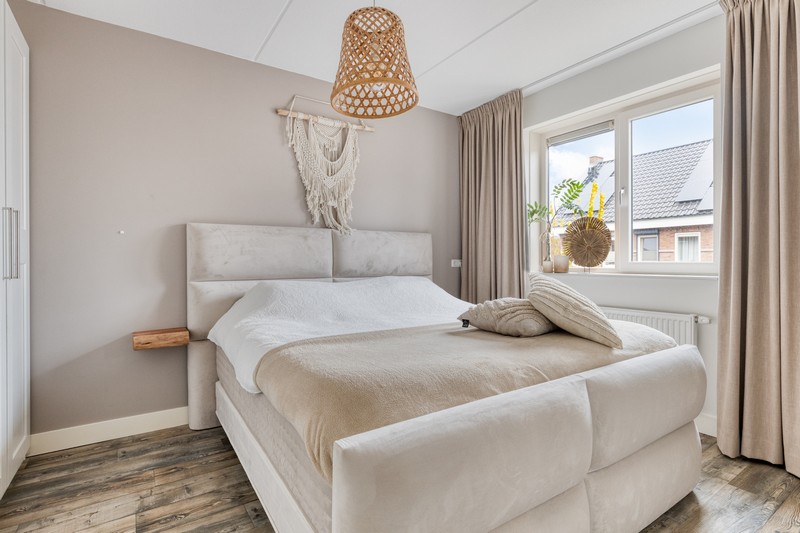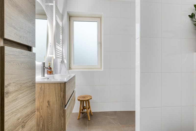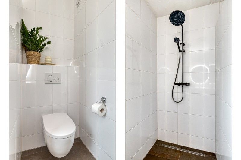 Op de eerste verdieping vinden we de overloop, drie lichte, fijne slaapkamers en een moderne badkamer. Deze is voorzien van een inloopdouche, wastafelmeubel met extra kastruimte en verlichte spiegel en een handig tweede (hang)toilet.