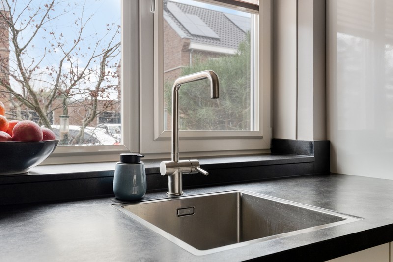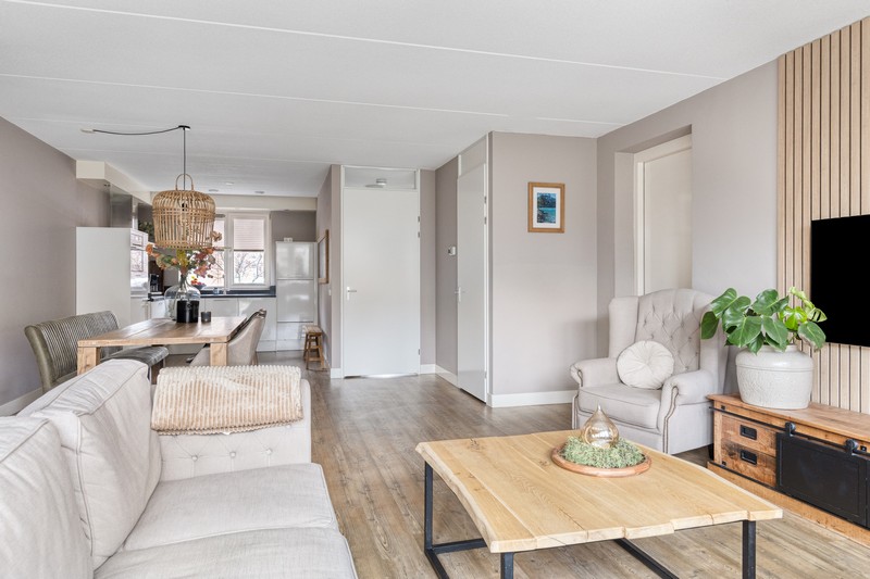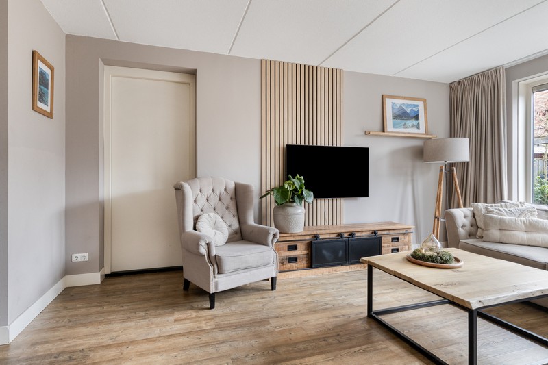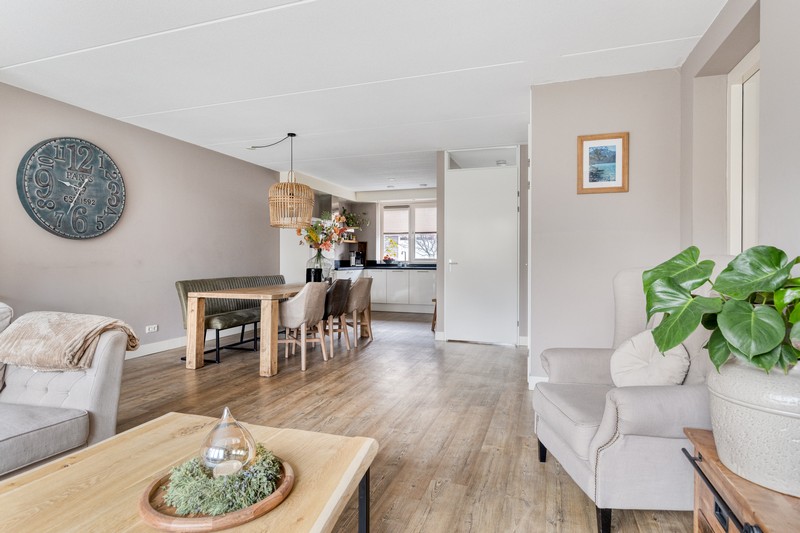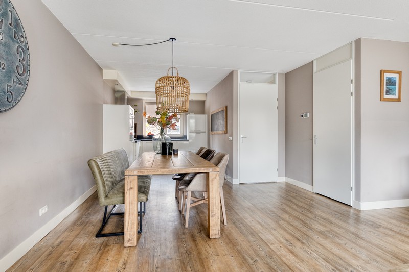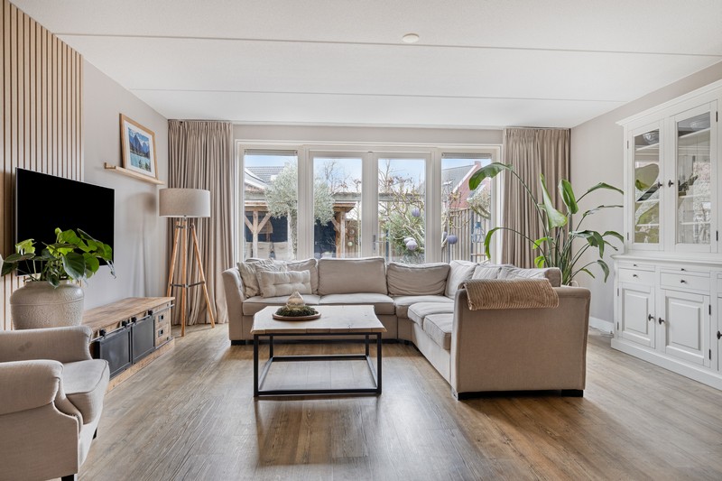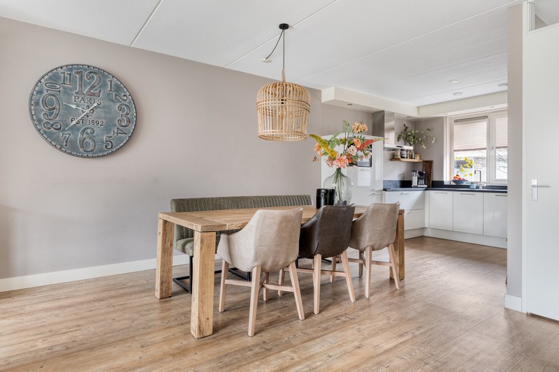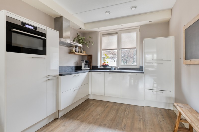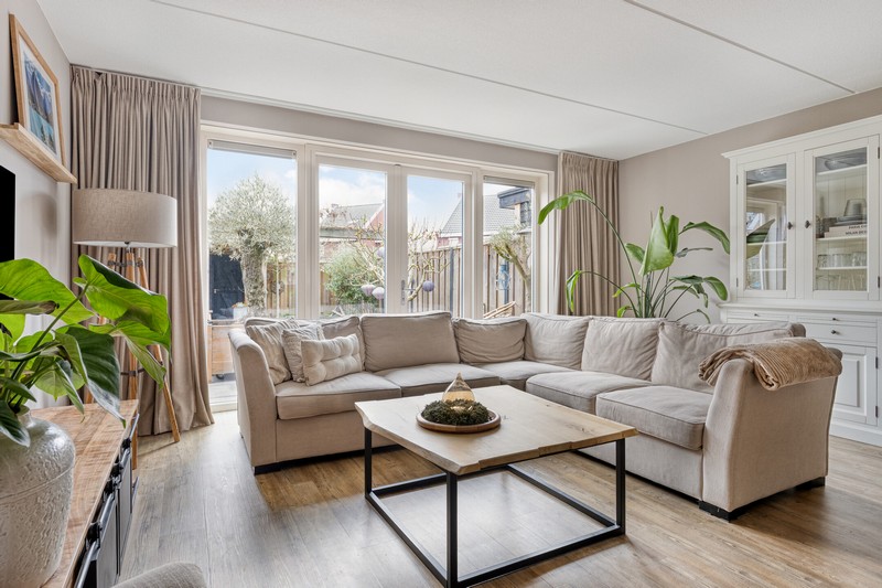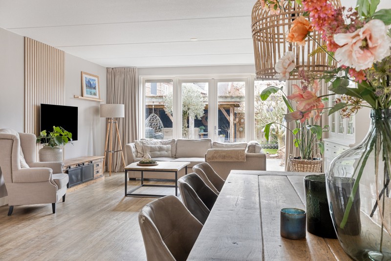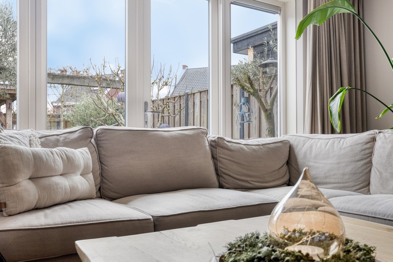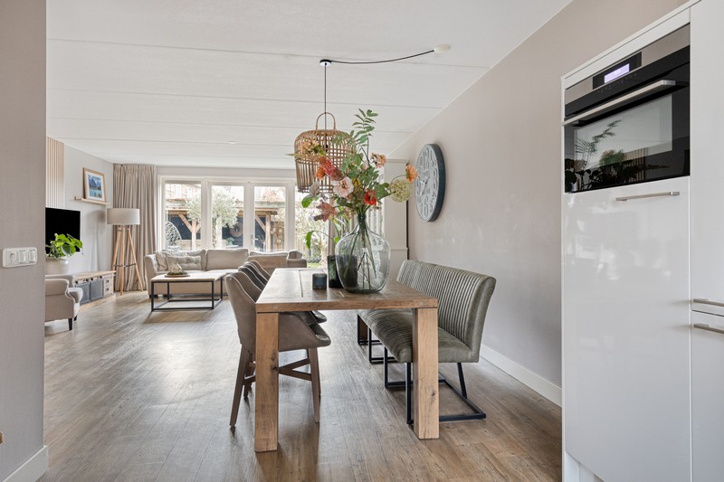 De woning is aan de achterzijde over de volle breedte uitgebouwd en dat is te merken ook! De woonkamer aan de achterzijde heeft openslaande deuren en grote raampartijen tot aan de grond waardoor binnen en buiten onlosmakelijk met elkaar verbonden zijn. En wat een lichtinval. Heerlijk! En als kers op de taart: de gehele begane grond is voorzien van comfortabele vloerverwarming.